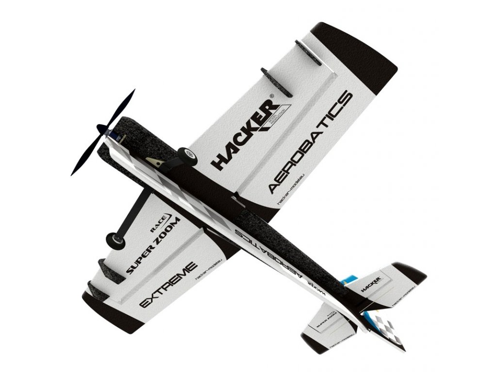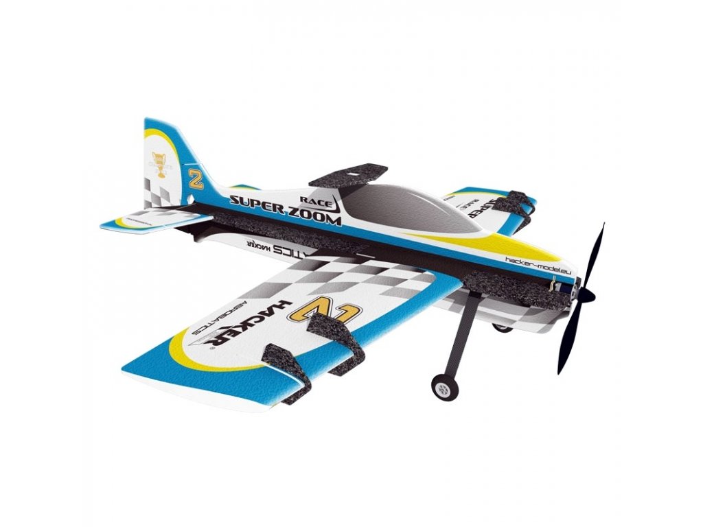 Oblíbený akrobatický model v nové verzi v atraktivních barevných variantách s větší plochou křidélek, větší boční plochou trupu a generátory bočního vztlaku (SFG). Koncepce „shock“, křídlo se symetrickým profilem a celková geometrie modelu dělají ze Super Zooma Race výkonný model pro létání extrémní akrobacie. Hlavní díly modelu jsou vyrobeny z expandovaného polypropylenu (EPP), který zajišťuje výbornou odolnost modelu jak při létání tak při drobných karambolech. Model je vybaven podvozkem z uhlíkových a skelných vláken.