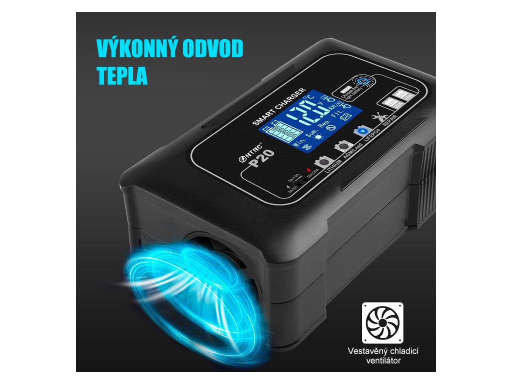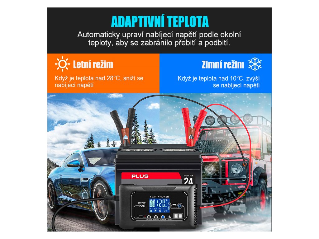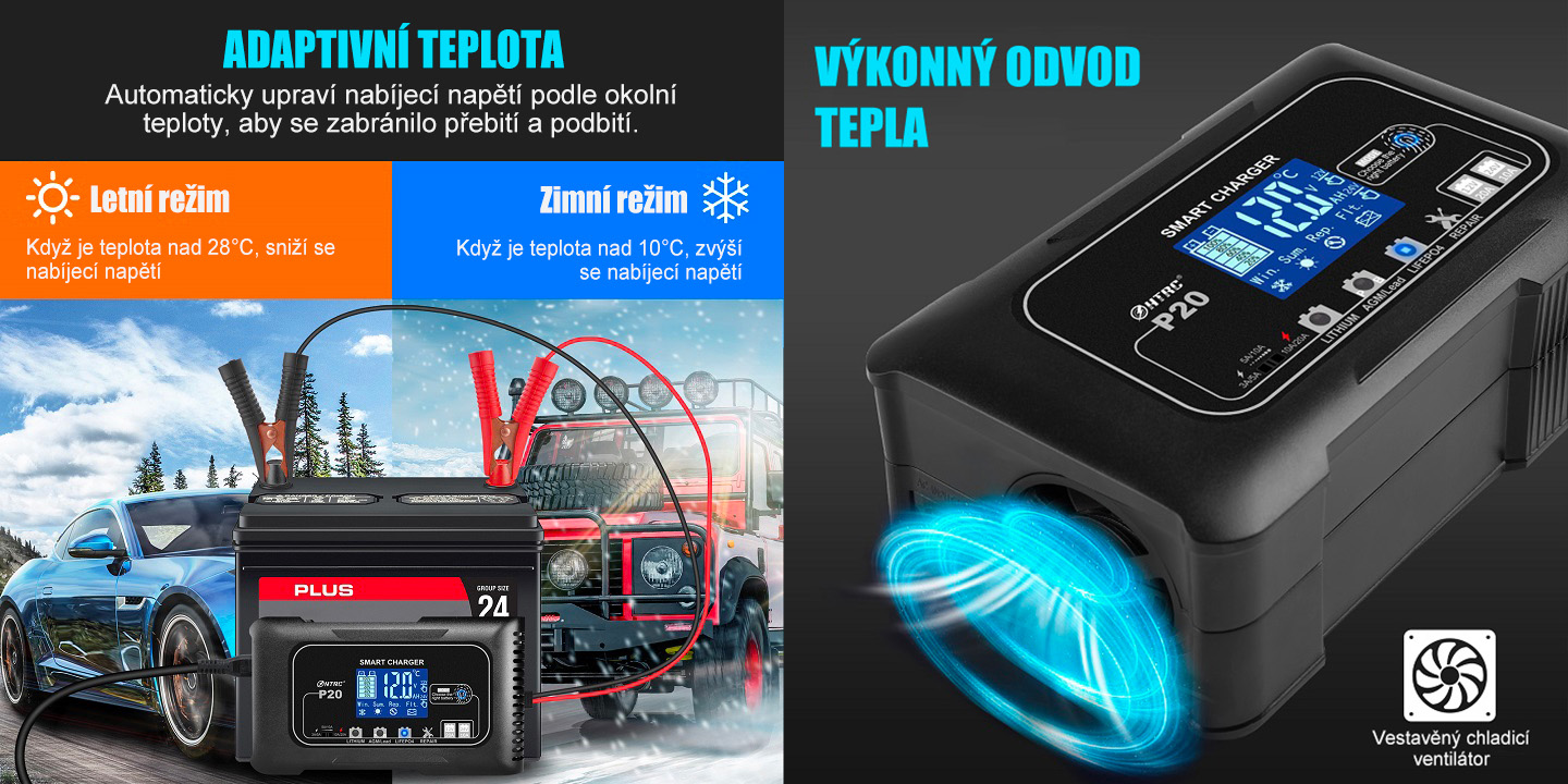 Inteligentní adaptivní regulace teploty automaticky upravuje nabíjecí napětí podle okolních podmínek – v letním režimu snižuje napětí při vyšších teplotách, aby zabránila přebíjení, zatímco v zimním režimu napětí zvyšuje pro správné dobití baterie v chladu. Stabilní a bezpečný provoz zajišťuje také výkonný odvod tepla s vestavěným chladicím ventilátorem, který udržuje optimální teplotu nabíječky i při dlouhodobém nebo vysokém zatížení.