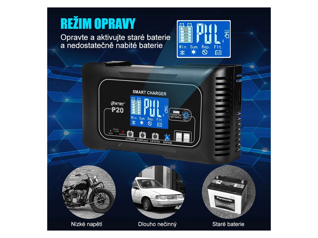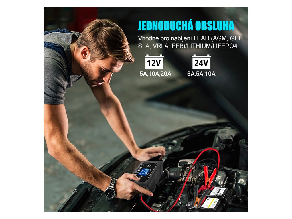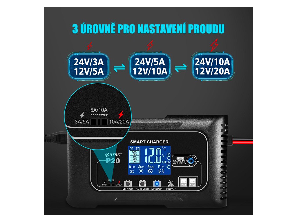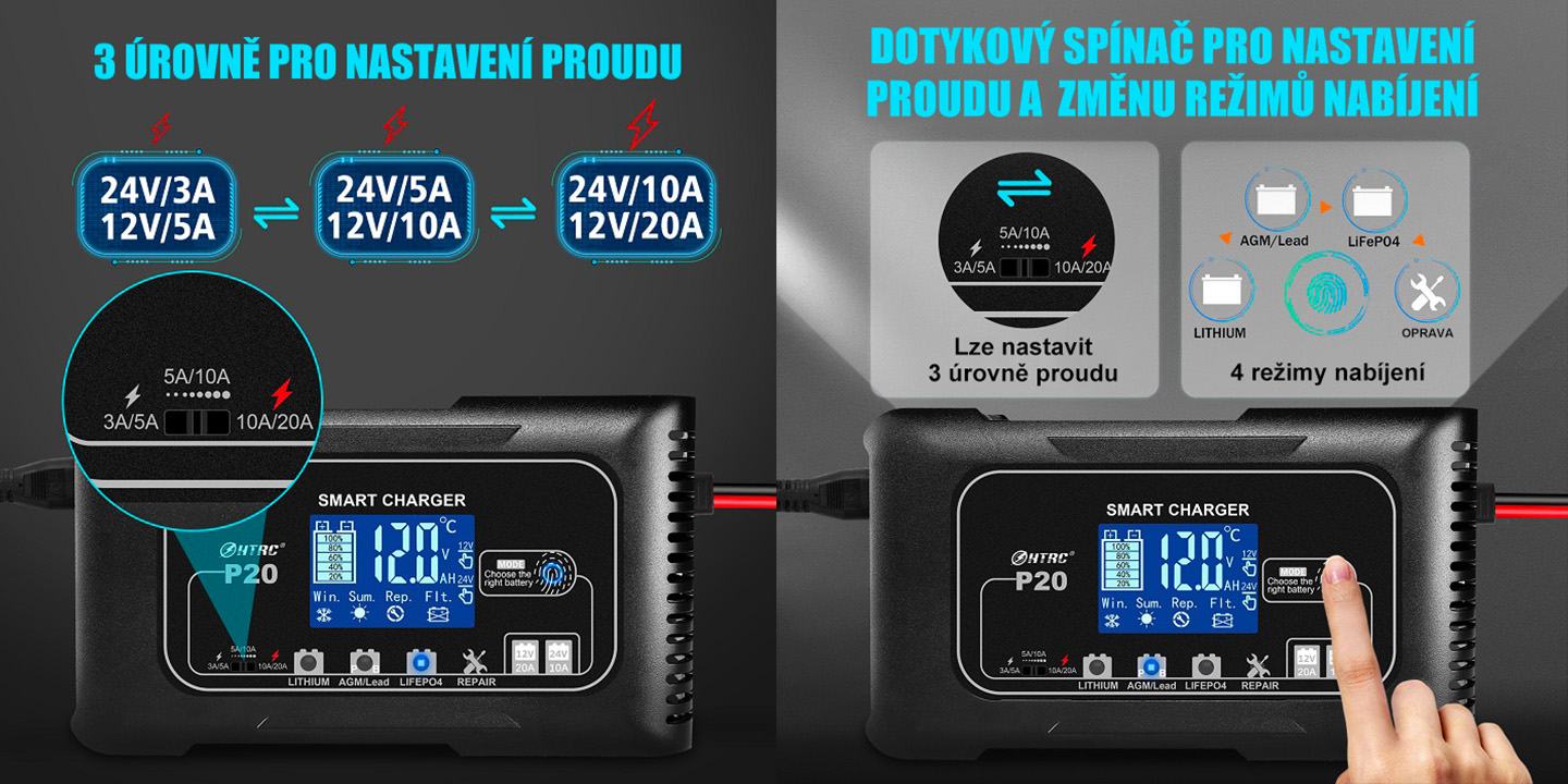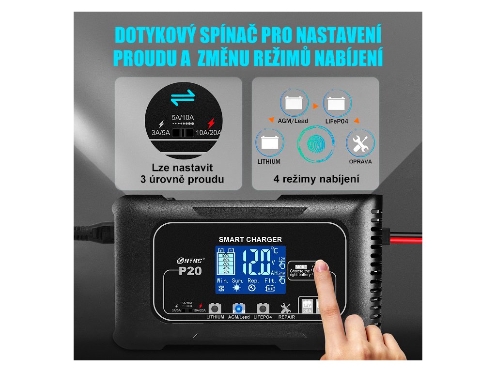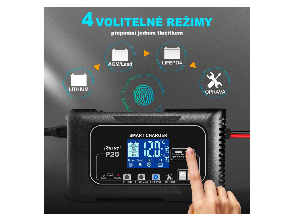 Nabíječka umožňuje volbu 3 úrovní nabíjecího proudu podle typu a kapacity baterie (12V až 20A / 24V až 10A) a zároveň nabízí 4 režimy nabíjení – olověné (AGM, GEL, SLA, EFB), Lithium, LiFePO4 a režim opravy. Vše se nastavuje jednoduše pomocí dotykového tlačítka, což zajišťuje rychlou obsluhu, přesné přizpůsobení nabíjení a maximální šetrnost k baterii bez složitého nastavování.