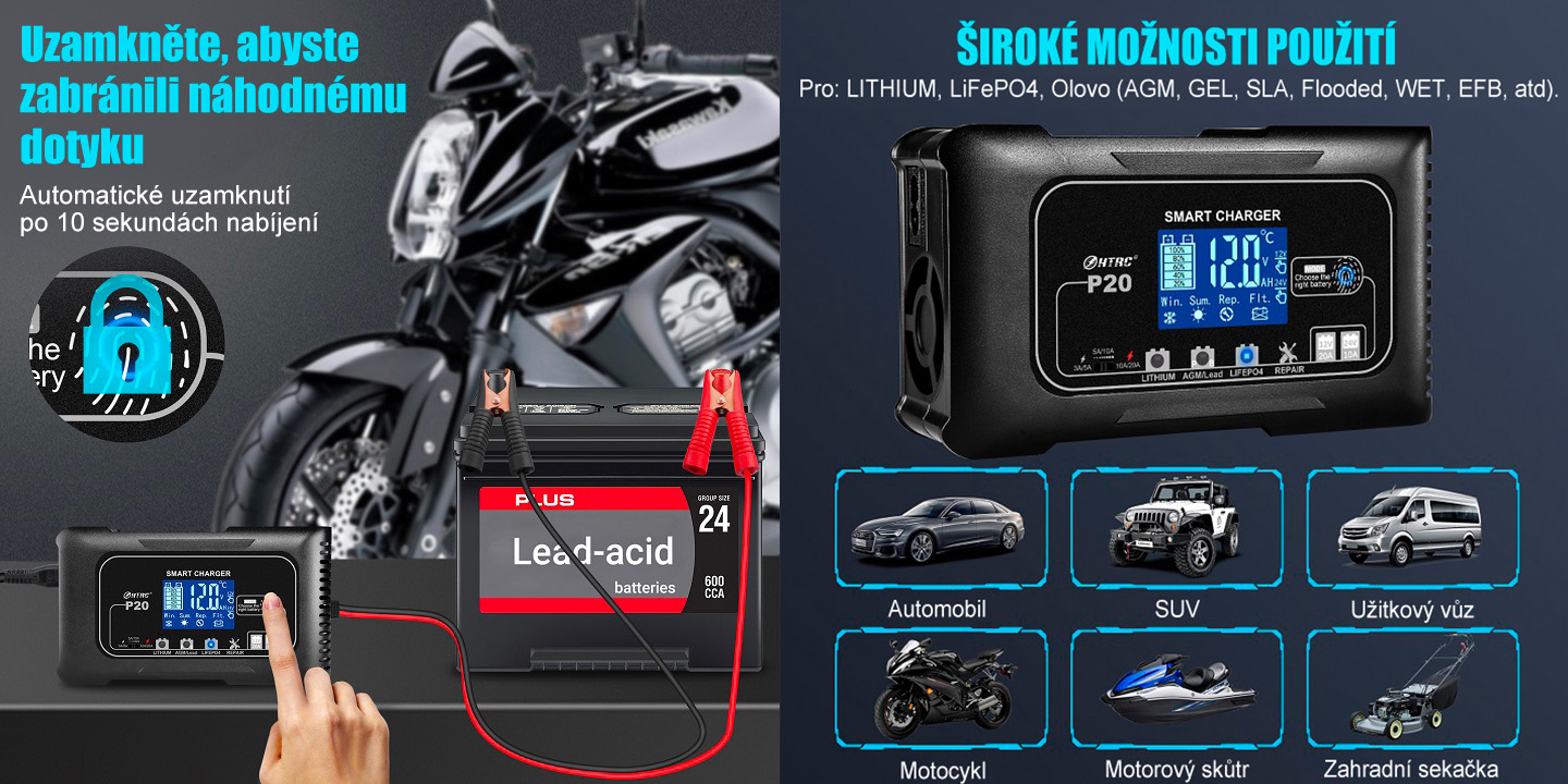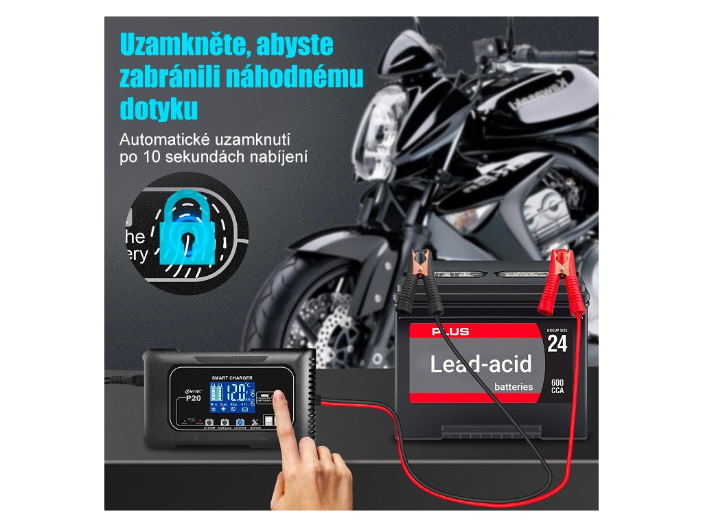 Pro maximální bezpečnost je nabíječka vybavena automatickým uzamčením ovládání, které se aktivuje po 10 sekundách nabíjení a zabrání nechtěnému dotyku či změně nastavení. Zároveň nabízí široké možnosti použití – je kompatibilní s bateriemi Lithium, LiFePO4 i olověnými (AGM, GEL, SLA, Flooded, WET, EFB) a hodí se pro automobily, SUV, užitkové vozy, motocykly, skútry i zahradní techniku, takže jde o univerzální řešení pro domácí i profesionální použití.