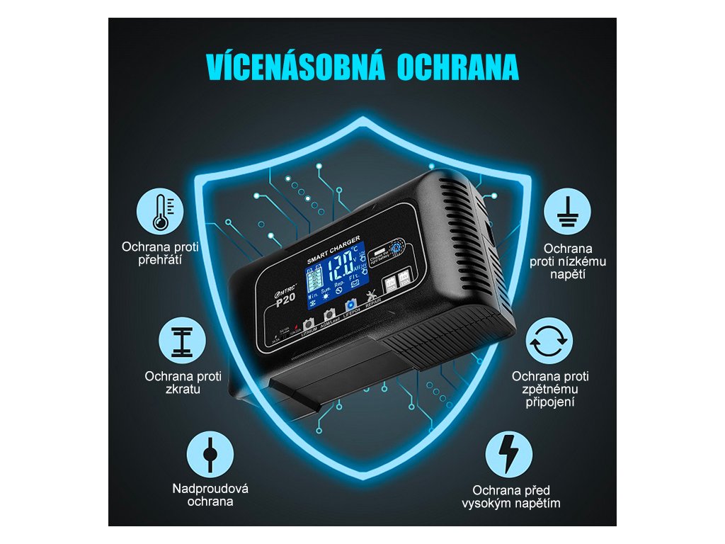 Integrovaná vícenásobná ochrana chrání baterii i samotnou nabíječku před přehřátím, zkratem, přepólováním, nadproudem, nízkým i vysokým napětím, takže je zajištěno bezpečné nabíjení za všech okolností. Součástí je také režim opravy, který pomáhá aktivovat staré, dlouho nepoužívané nebo hluboce vybité baterie pomocí speciálního pulzního nabíjení, čímž může obnovit jejich výkon a prodloužit životnost.