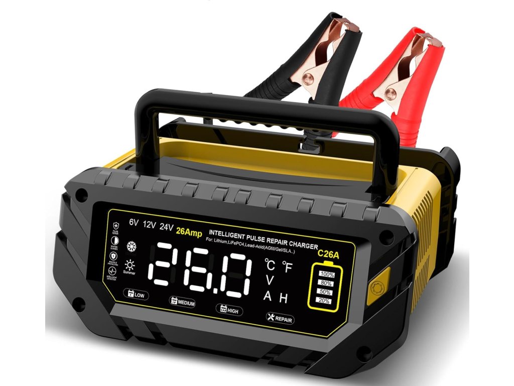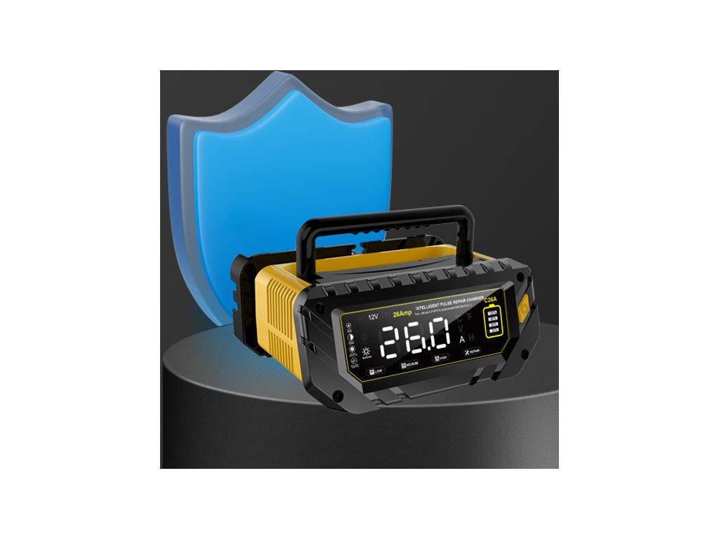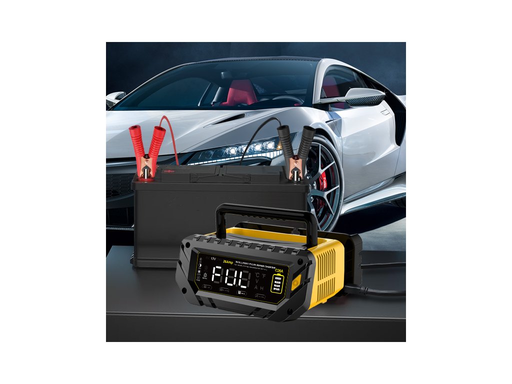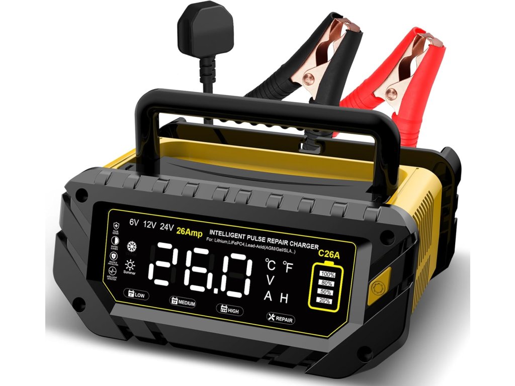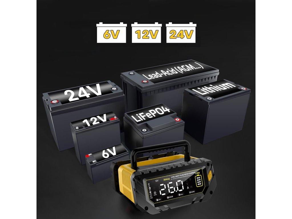Plně automatická inteligentní nabíječka autobaterií 6V / 12V / 24V s maximálním nabíjecím proudem až 26A je určena pro lithiové baterie, LiFePO4 a olověné akumulátory (AGM, GEL, SLA, MF, EFB, WET aj.). Podporuje nabíjení 6V (10A), 12V (26A) a 24V (13A) a je vhodná pro široké spektrum vozidel – osobní auta, SUV, motocykly, lodě, obytné vozy, traktory, sekačky na trávu i další techniku. Nabíječka pracuje plně automaticky, disponuje přehledným LCD displejem, teplotní kompenzací a udržovacím režimem pro dlouhodobé připojení baterie.