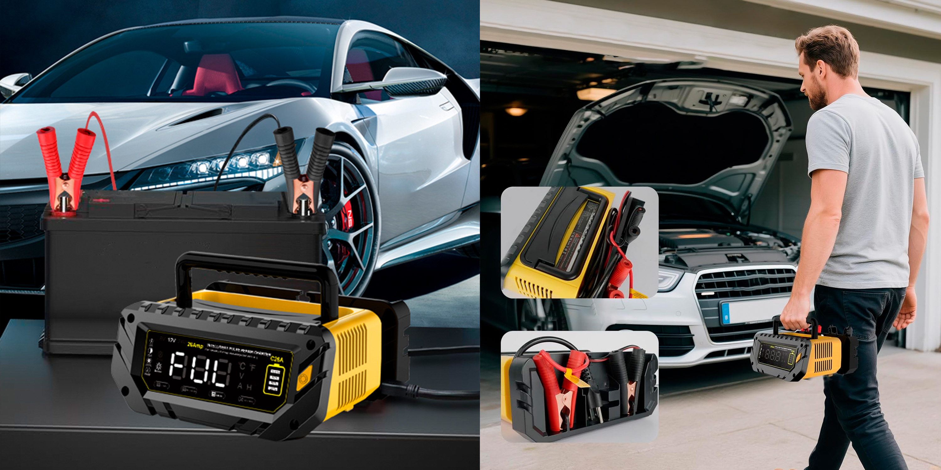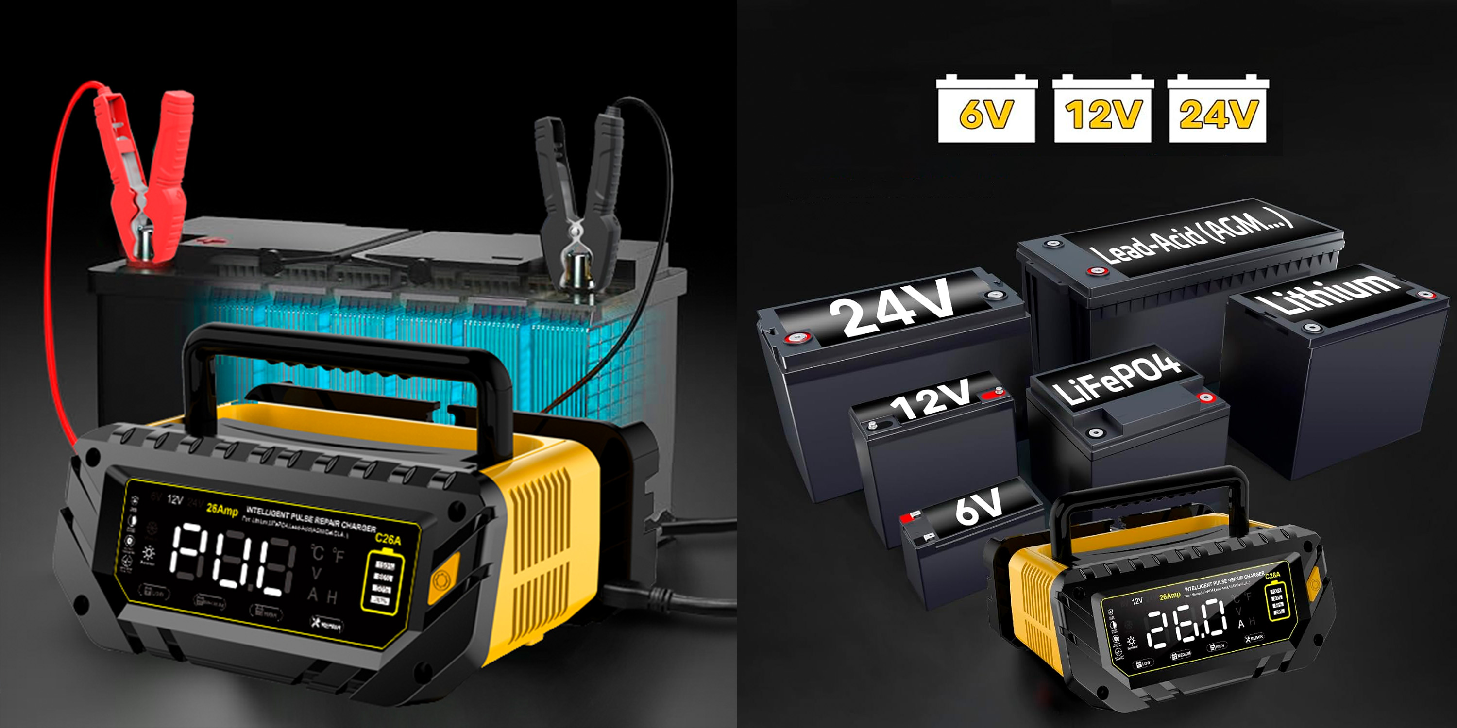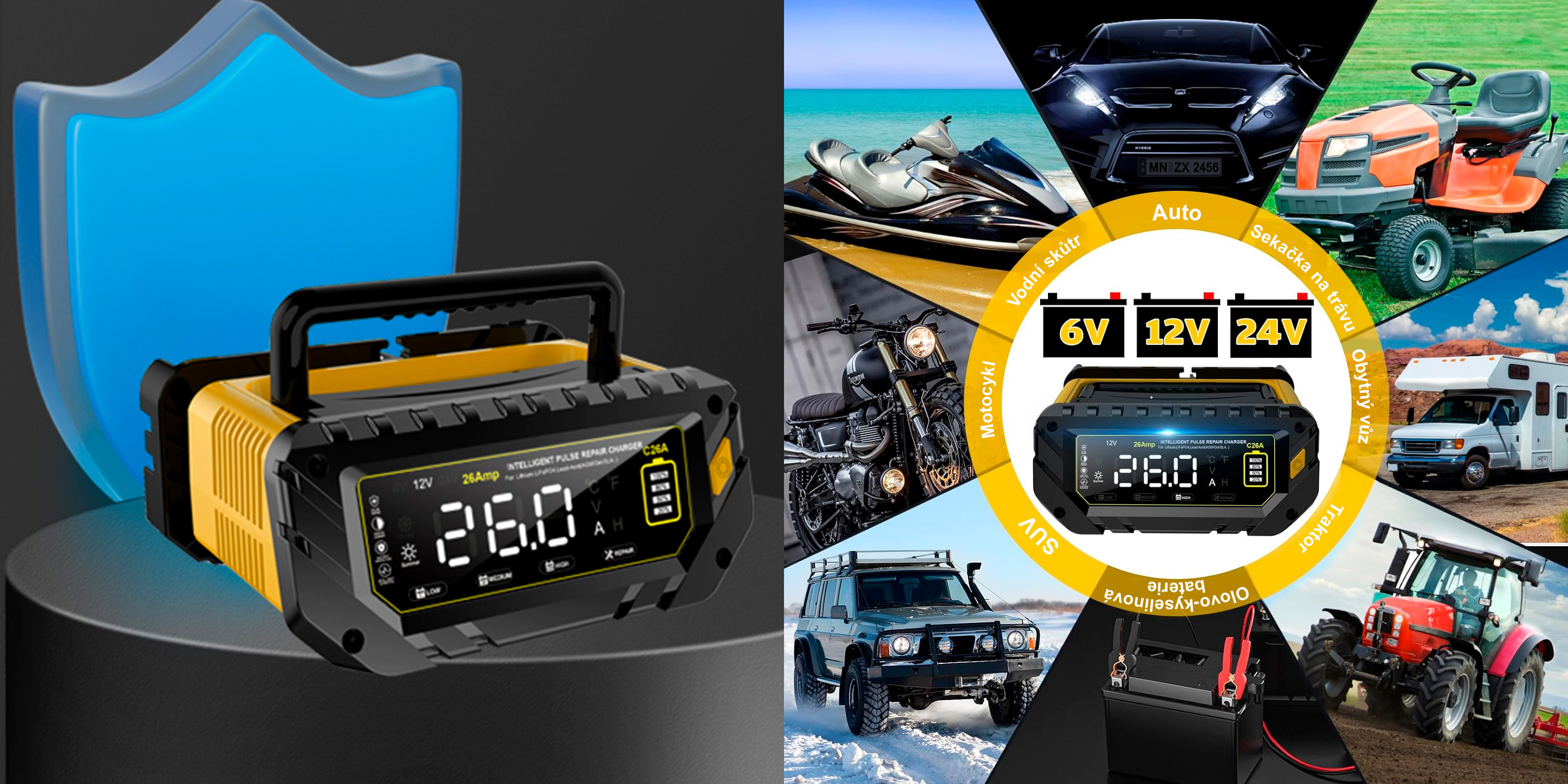 Plně automatická inteligentní nabíječka autobaterií 6V / 12V / 24V s maximálním nabíjecím proudem až 26A je určena pro lithiové baterie, LiFePO4 a olověné akumulátory (AGM, GEL, SLA, MF, EFB, WET aj.). Podporuje nabíjení 6V (10A), 12V (26A) a 24V (13A) a je vhodná pro široké spektrum vozidel – osobní auta, SUV, motocykly, lodě, obytné vozy, traktory, sekačky na trávu i další techniku. Nabíječka pracuje plně automaticky, disponuje přehledným LCD displejem, teplotní kompenzací a udržovacím režimem pro dlouhodobé připojení baterie.