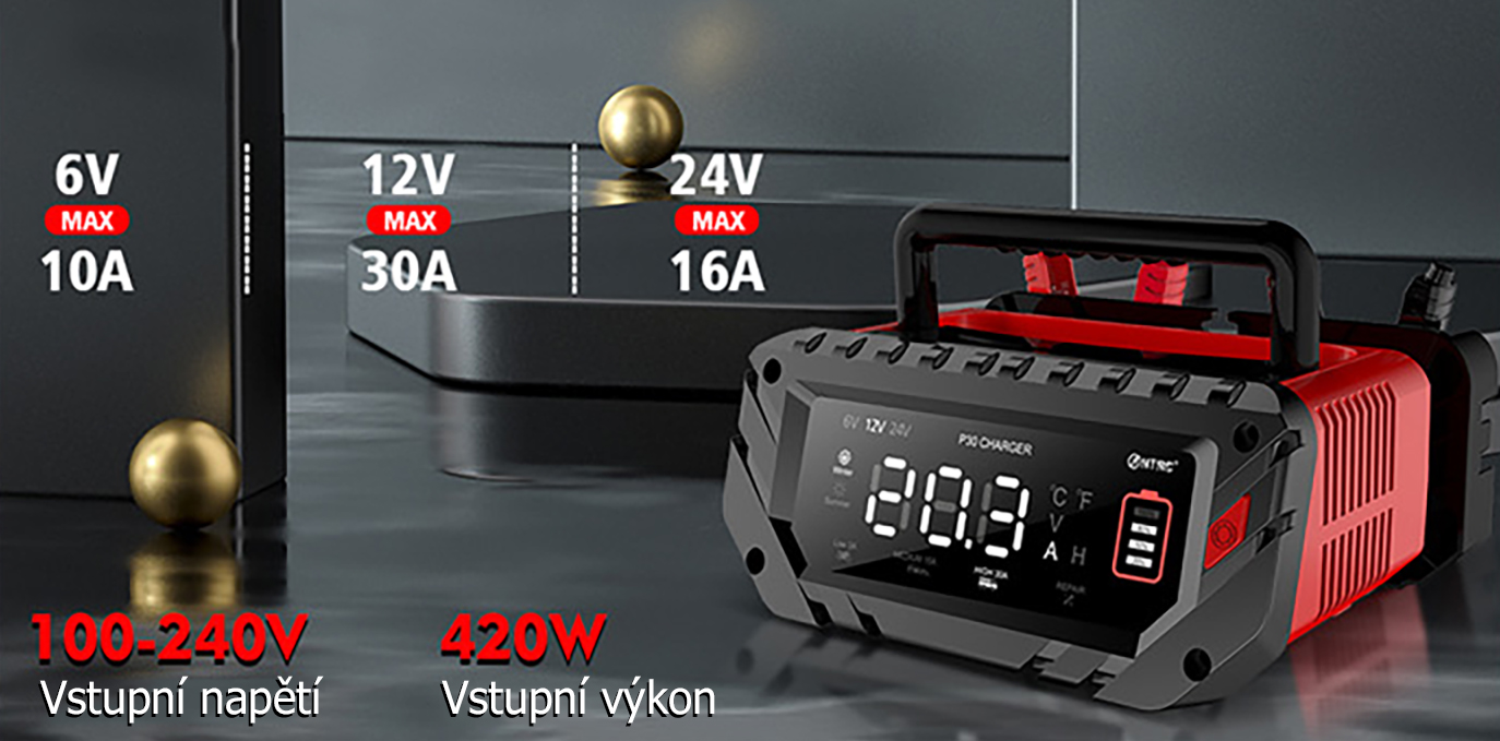 Nabíječka P30 Pro nabízí podporu 6V, 12V a 24V baterií s nabíjecím proudem až 30 A pro 12V, 16 A pro 24V a 10 A pro 6V systémy. Díky širokému vstupnímu napětí 100–240 V a maximálnímu výkonu 420 W zajišťuje rychlé a efektivní nabíjení širokého spektra akumulátorů doma, v dílně i na cestách.