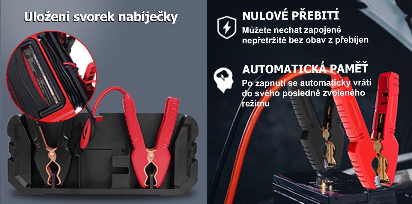 Integrované uložení svorek a kabelů umožňuje udržet nabíječku vždy přehledně uspořádanou a připravenou k použití. Technologie nulového přebití dovoluje ponechat zařízení trvale připojené bez rizika poškození baterie, zatímco automatická paměť si zapamatuje poslední zvolený režim a po opětovném zapnutí jej sama obnoví. Díky tomu je používání maximálně pohodlné a bezpečné.