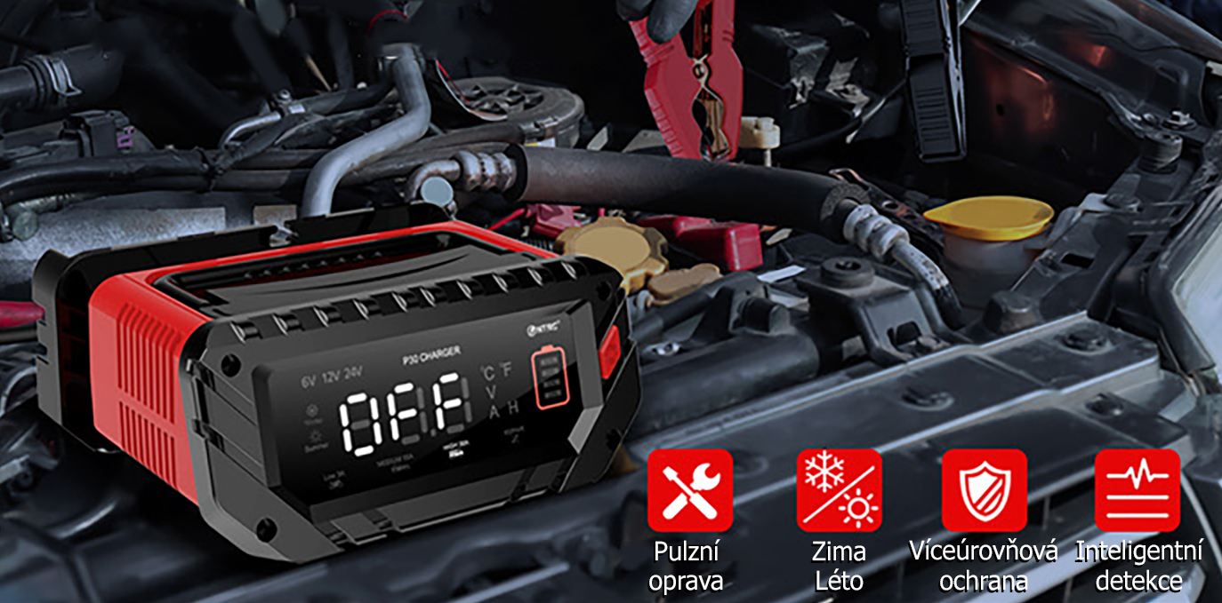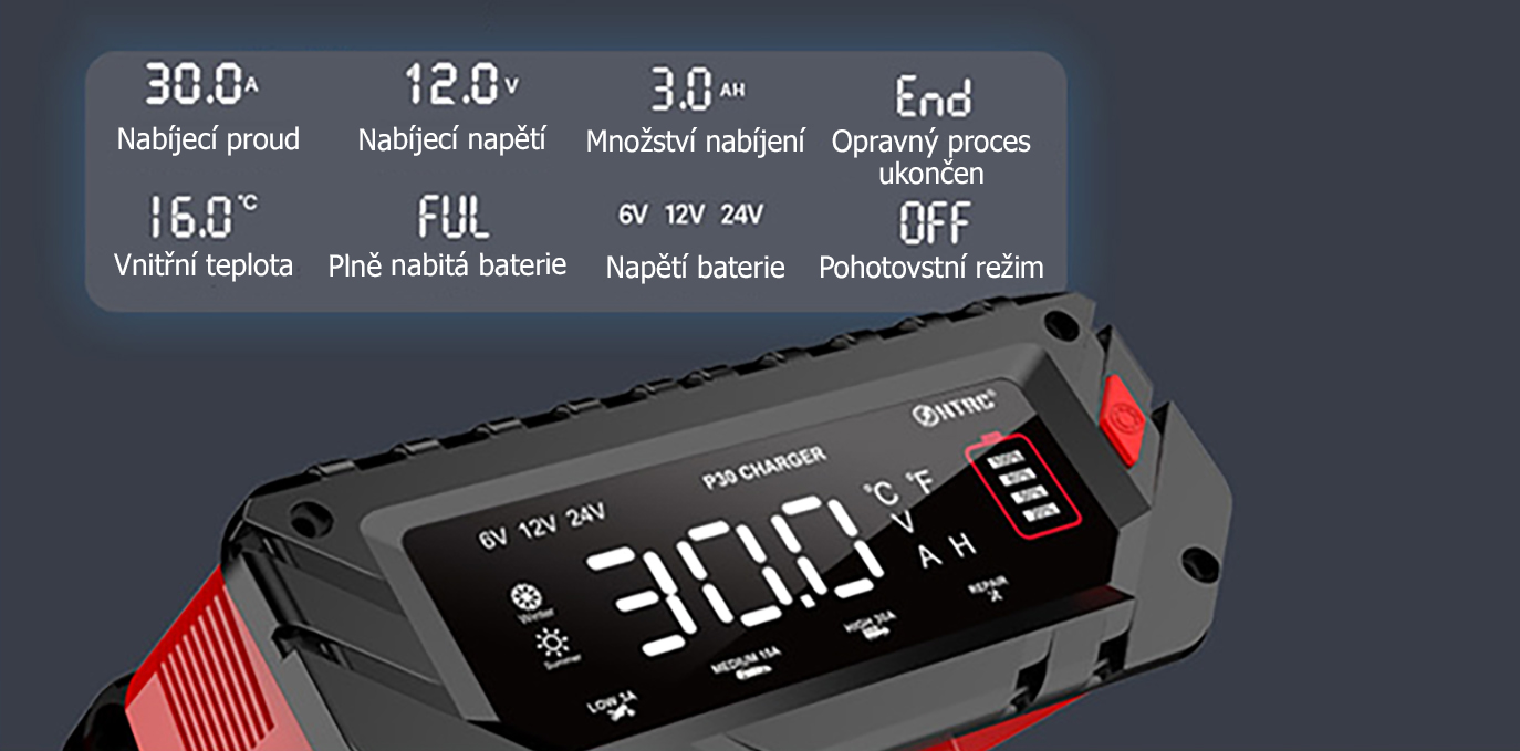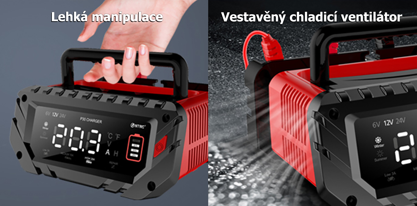 Nabíječka P30 Pro využívá inteligentní nabíjecí proces včetně pulzní opravy, který pomáhá obnovit výkon i u oslabených nebo dlouhodobě nečinných baterií. Automatický zimní a letní režim přizpůsobuje nabíjecí napětí aktuální teplotě, zatímco víceúrovňová ochrana a inteligentní detekce zajišťují bezpečné, stabilní a plně automatické nabíjení bez nutnosti ručního nastavování.