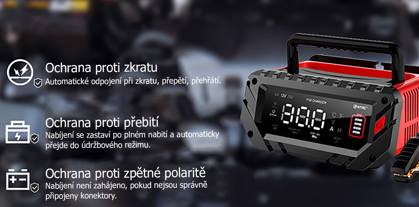 Nabíječka P30 Pro je vybavena ochranou proti zkratu, ochranou proti přebití a ochranou proti zpětné polaritě, které zajišťují maximální bezpečnost při každém použití. Při zkratu, přepětí nebo přehřátí dochází k automatickému odpojení, po plném nabití se zařízení samo přepne do udržovacího režimu a při nesprávném zapojení kabelů nabíjení vůbec nespustí. Díky tomu je provoz spolehlivý, bezpečný a bez rizika poškození baterie.