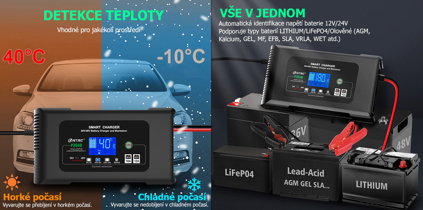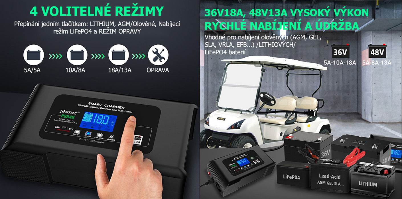 Kompatibilní baterie: 36V/48V Lithium, LiFePO4, olověné baterie (AGM, GEL, SLA, Flooded, Wet, EFB atd.)