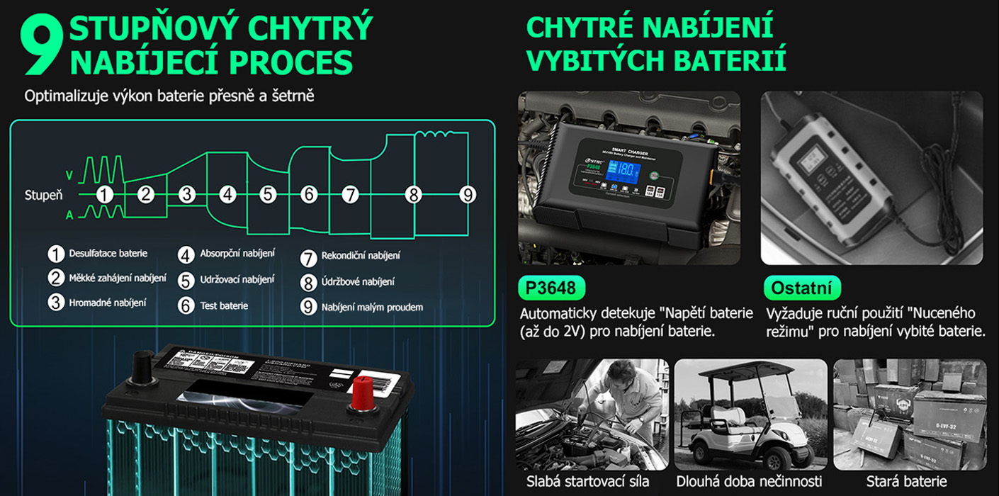 9stupňový inteligentní nabíjecí proces a obnova vybitých baterií