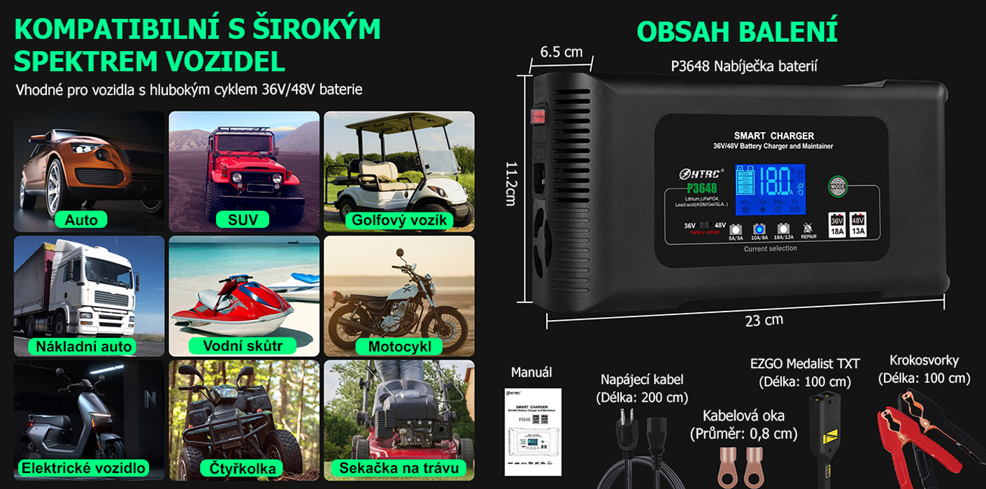 Díky podpoře 36V a 48V baterií je řešení vhodné pro široké spektrum vozidel a techniky s hlubokocyklovými akumulátory – od osobních a nákladních vozů přes SUV, motocykly, golfové vozíky, čtyřkolky až po vodní skútry a zahradní stroje. Kompaktní rozměry usnadňují manipulaci i skladování a kompletní obsah balení umožňuje okamžité použití bez nutnosti dokupování příslušenství – součástí je napájecí kabel, kabelová oka, krokosvorky i přehledný manuál.