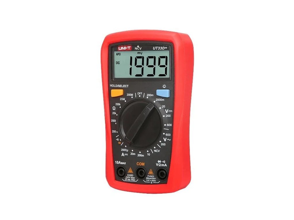 Multimetr UNI-T UT33D+ je bezpečný přístroj vhodný pro každodenní měření. Kromě běžného měření napětí, proudu a odporu umožňuje rovněž měření teploty. Kvalitní provedení, bezpečnost a jednoduché použití jsou hlavní výhody tohoto multimetru se skvělým poměrem cena/výkon.