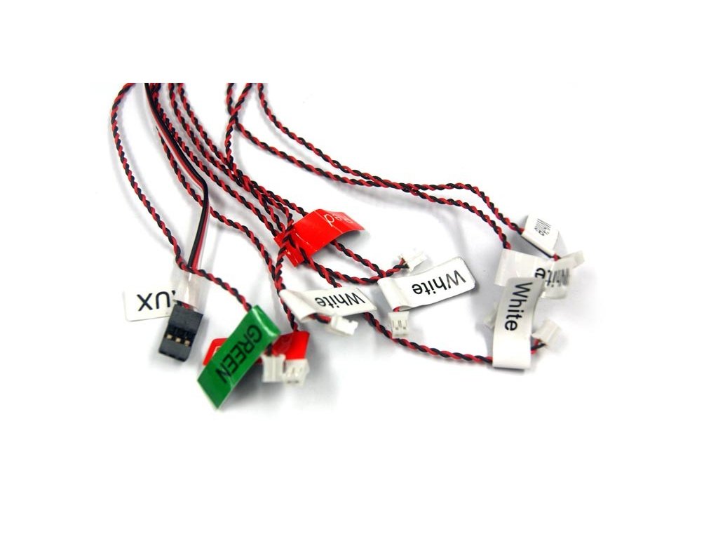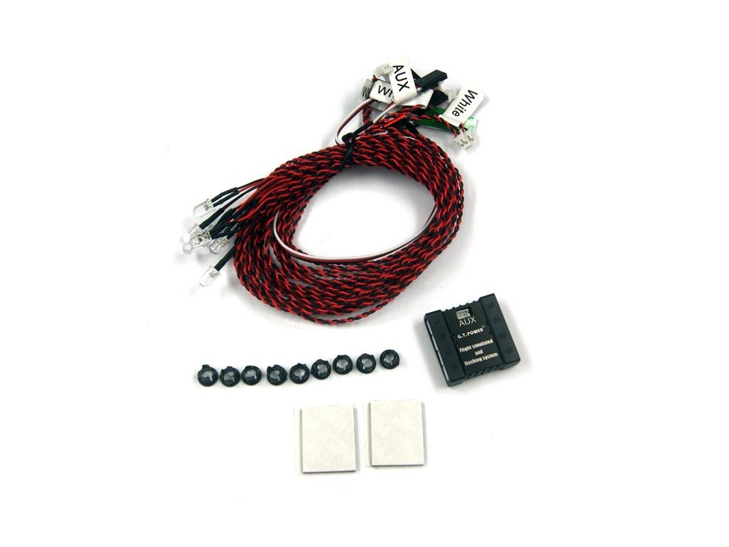 2.Osm samostatných světel: anti-kolizní červený maják, záblesková bílá světla, navigační světla (levá strana je červená, pravá strana je zelená), přistávací světla.