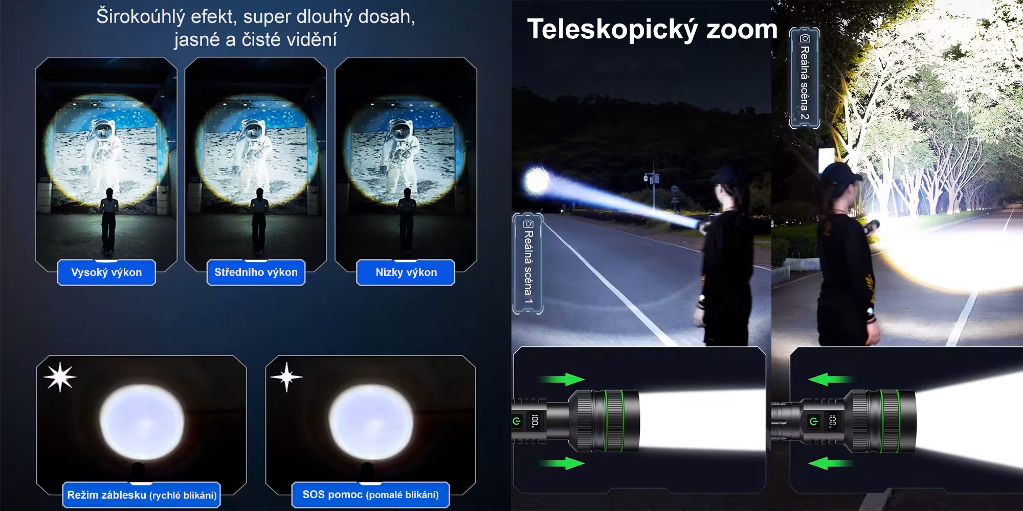 K dispozici jsou tři úrovně výkonu označené jako Vysoký výkon, Střední výkon a Nízký výkon, které umožňují přizpůsobit intenzitu světla aktuální situaci. Nechybí ani Režim záblesku (rychlé blikání) a SOS pomoc (pomalé blikání) pro krizové situace. Funkce Teleskopický zoom umožňuje měnit šířku světelného kuželu – od širokoúhlého efektu až po úzký paprsek s dlouhým dosahem. Světlo poskytuje jasné a čisté vidění i při osvětlení vzdálenějších objektů.