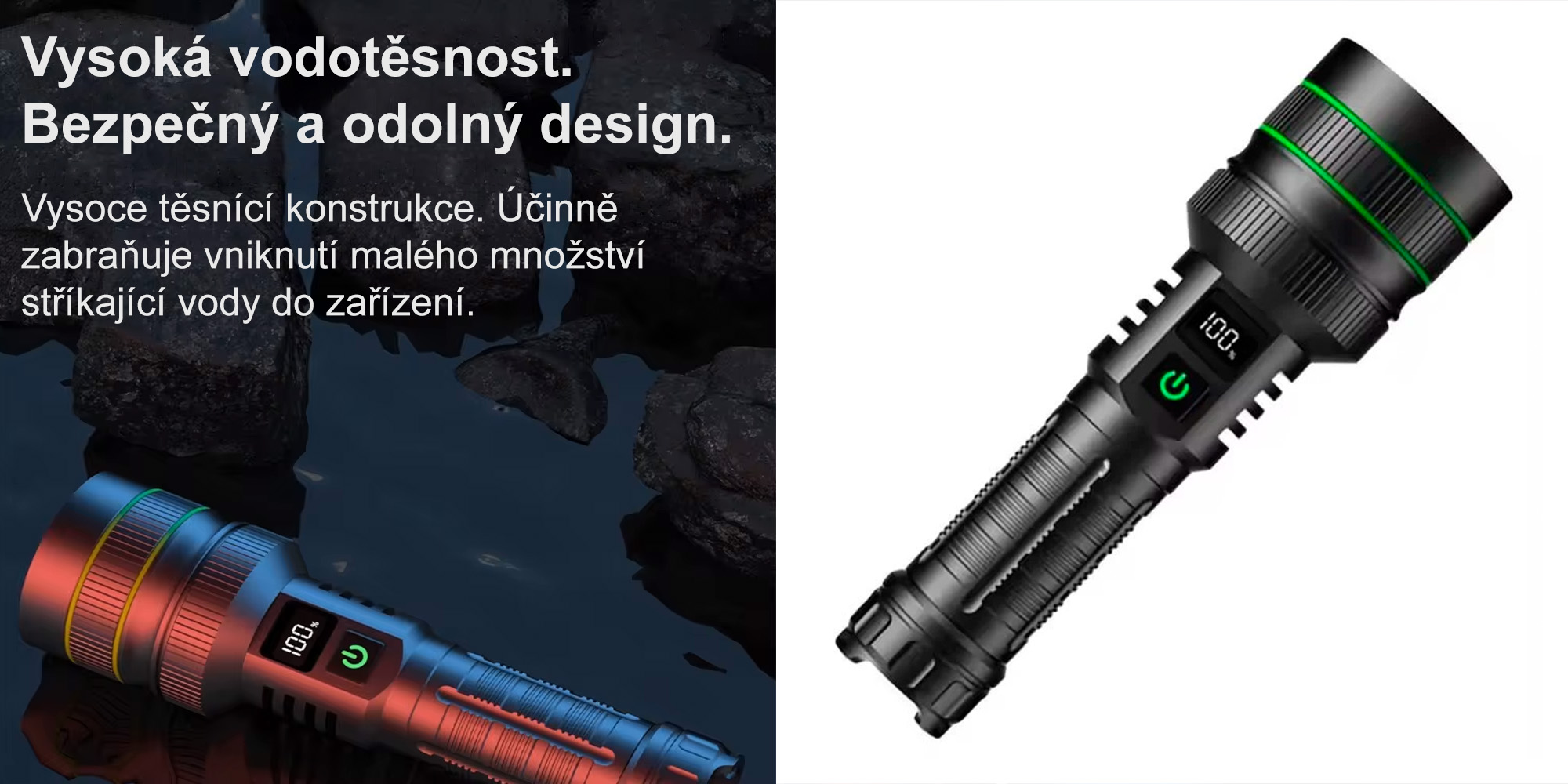 Extra silná svítilna 10000 lumenů s krytím IP67 je navržena pro použití ve městě i v přírodě. Díky nové vylepšené LED s dlouhým dosahem a teleskopickému zoomu umožňuje osvítit vzdálenost 1200–1500 metrů. Nabízí 5 režimů svícení včetně stroboskopu a SOS režimu pro nouzové situace.