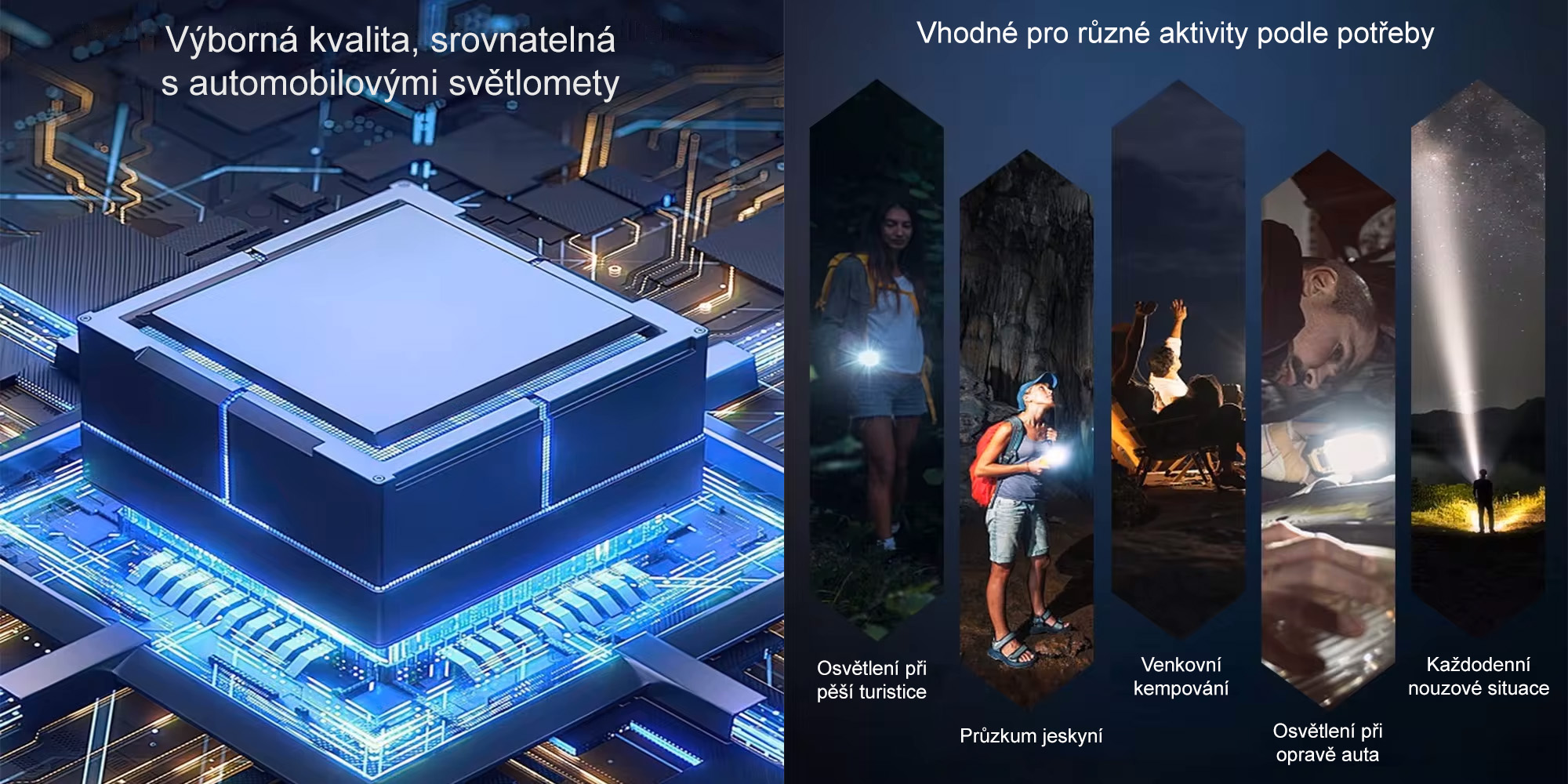 Nová generace LED nabízí výbornou kvalitu, srovnatelnou s automobilovými světlomety. Světlo je vhodné pro různé aktivity podle potřeby – osvětlení při pěší turistice, průzkum jeskyní, venkovní kempování, osvětlení při opravě auta i každodenní nouzové situace. Konstrukce podporuje sportovní outdoorové aktivity, jako je lov, výlety autem, turistika či lezení. Výkonný světelný zdroj zajišťuje stabilní a intenzivní osvětlení v různých podmínkách.