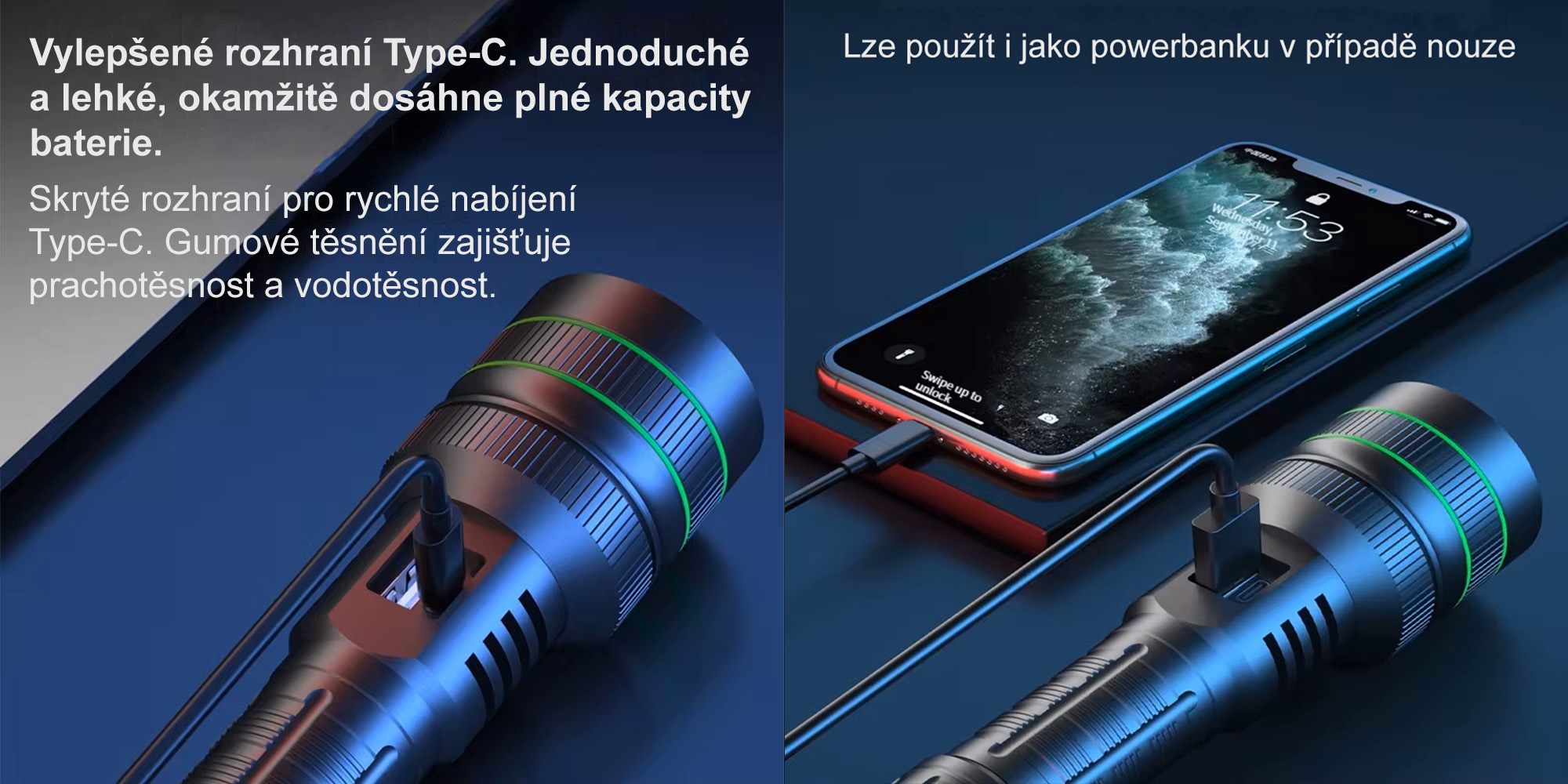 Vylepšené rozhraní Type-C umožňuje rychlé nabíjení, kabel je součástí balení. Podporovaný výstup je 5 V 1 A. Svítilnu lze použít i jako powerbanku v případě nouze. Gumové těsnění chrání nabíjecí port proti prachu a vlhkosti.