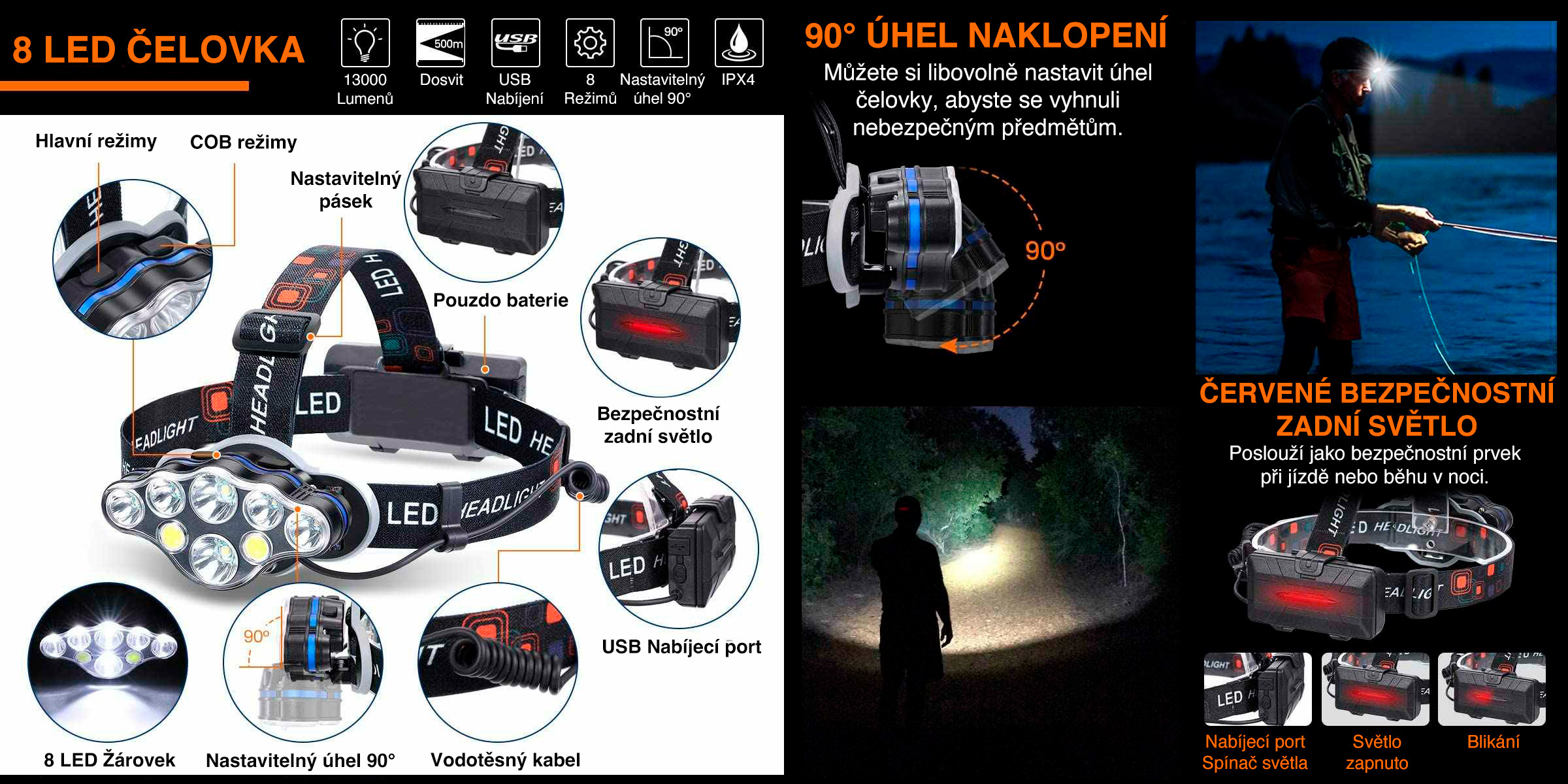 Model je vybaven samostatným ovládáním hlavního a COB světla a přehledným systémem režimů. Světelný modul umožňuje nastavení úhlu naklopení o 90° pro přesné směrování kuželu. Součástí je nastavitelné čelenkové uchycení, pouzdro na baterie a zadní bezpečnostní červené světlo s možností trvalého svitu i blikání. Nabíjení probíhá přes USB port a balení obsahuje micro USB kabel i 2× baterii 18650.