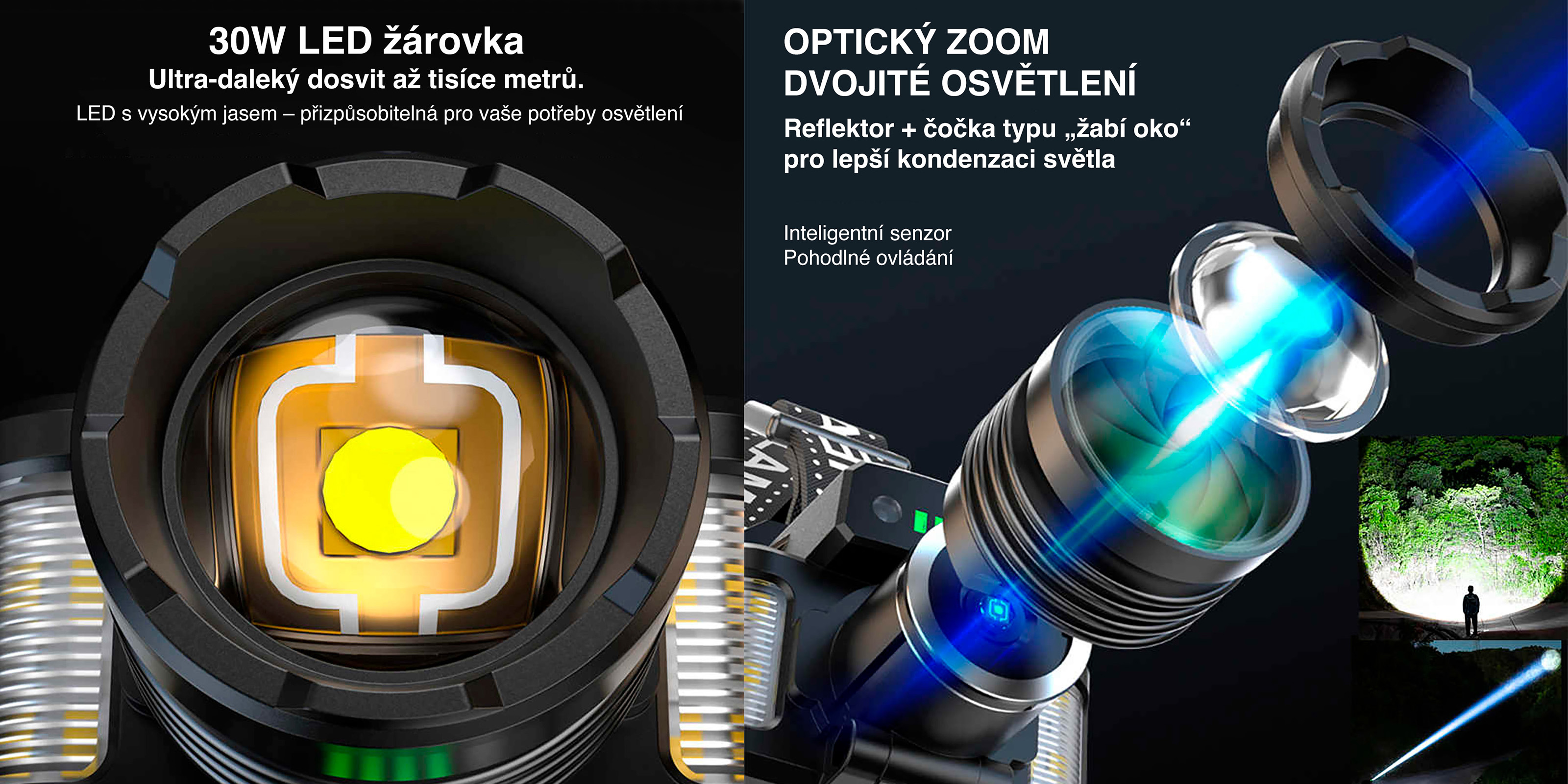 Osazena 30W LED diodou, která zajišťuje silný a intenzivní světelný výkon. Konstrukce světelného modulu podporuje vysoký jas a přizpůsobení osvětlení podle aktuálních potřeb. Dosvit je navržen tak, aby pokryl velmi dlouhou vzdálenost až tisíce metrů. Světlo je koncentrované a stabilní i při delším používání.