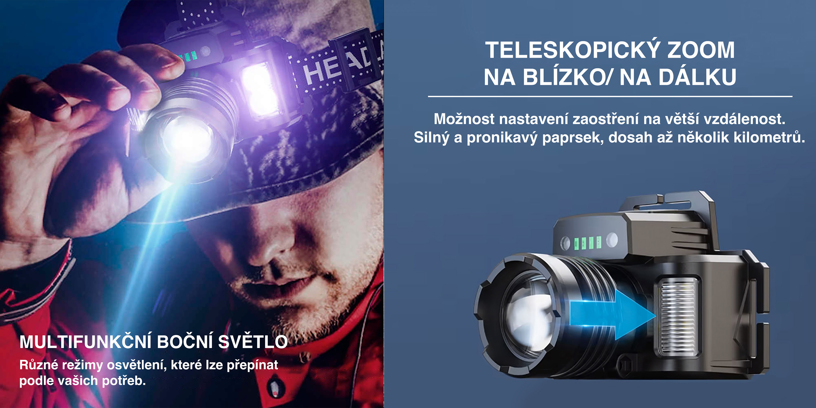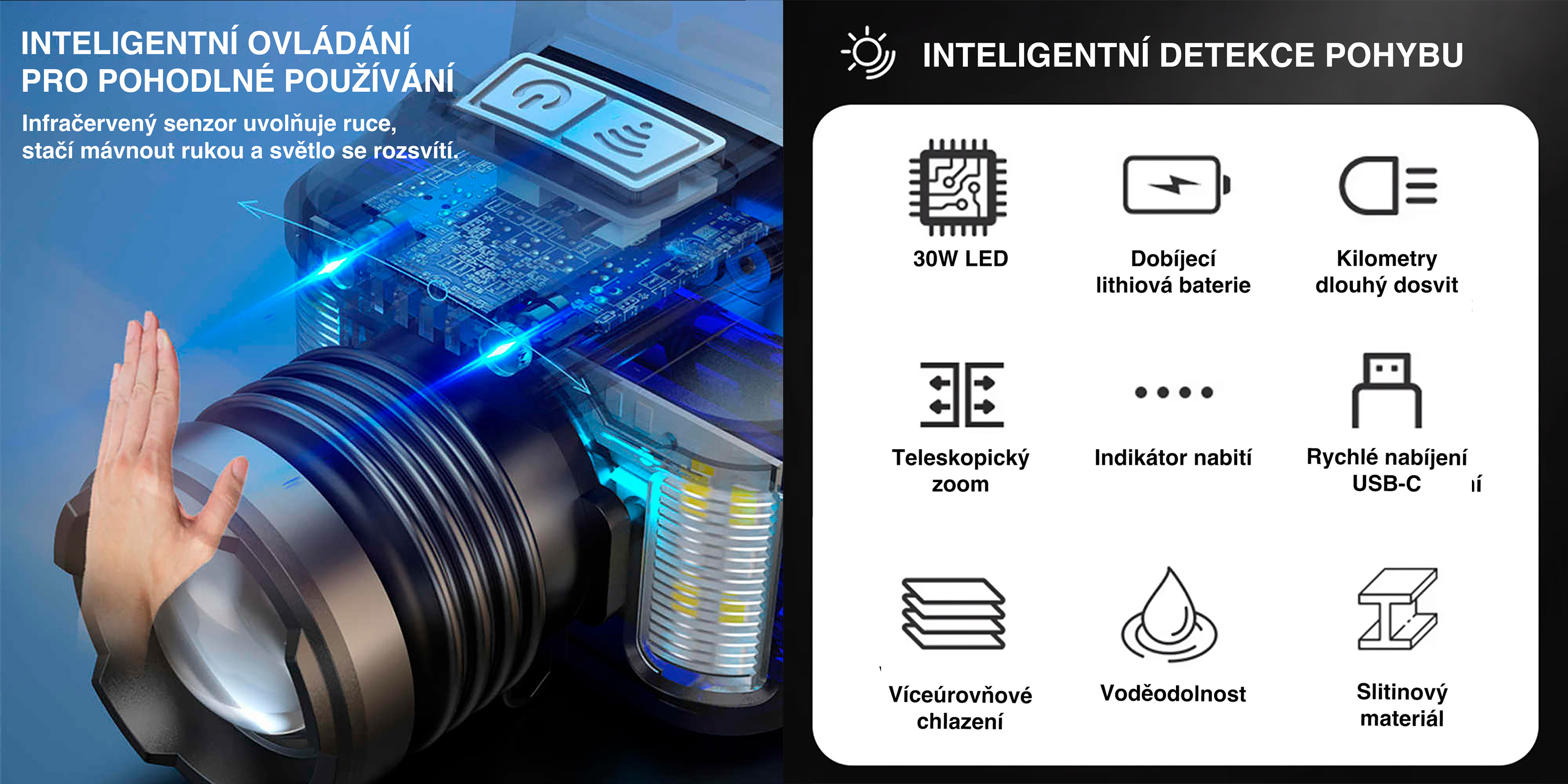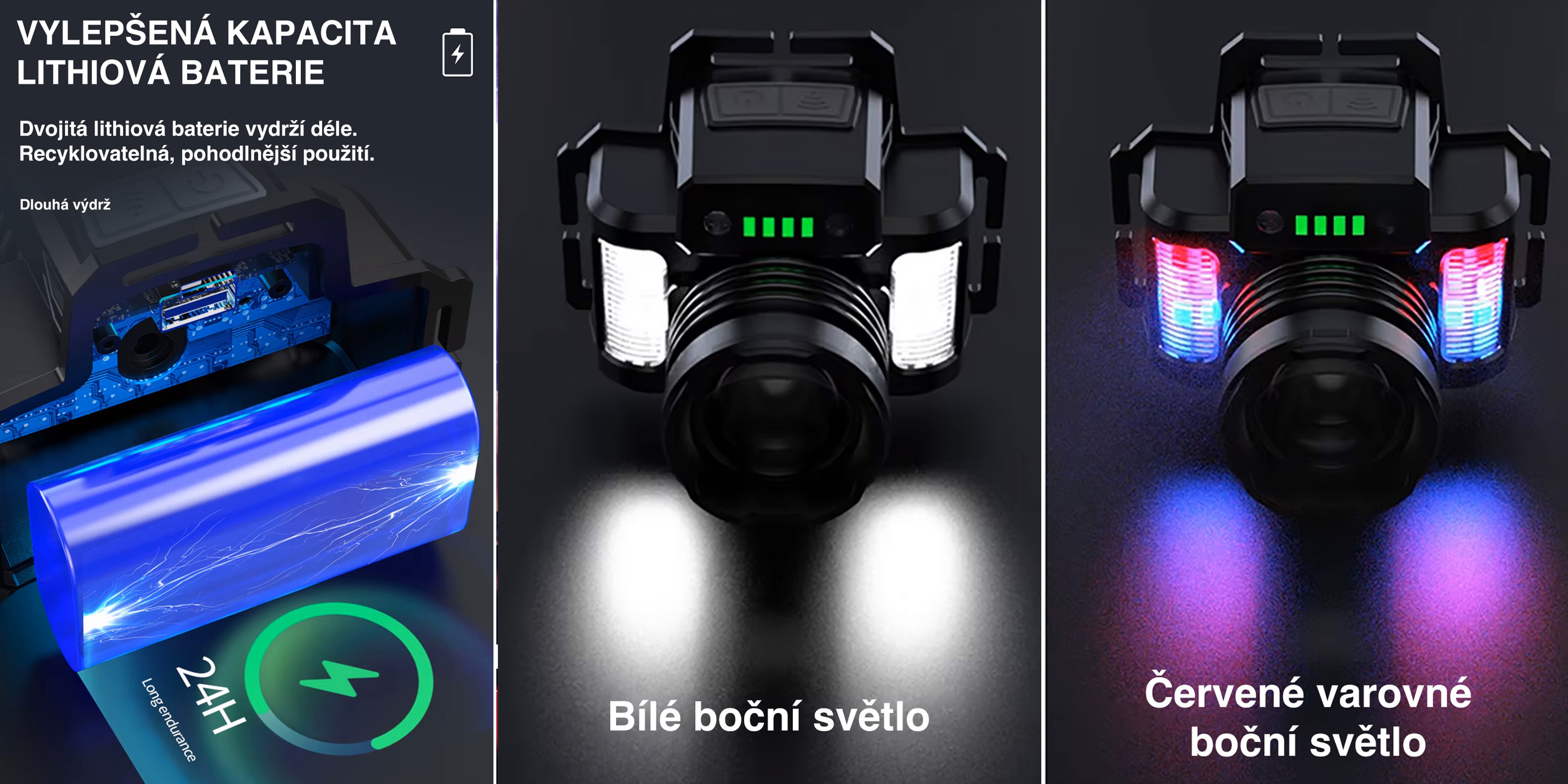 Infra senzor umožňuje rozsvícení pohybem ruky, což usnadňuje použití při práci i sportu. K dispozici jsou 3 režimy svícení, mezi kterými lze snadno přepínat. Boční světlo nabízí bílé osvětlení i červené varovné světlo pro lepší viditelnost a bezpečnost. Indikátor nabití přehledně zobrazuje aktuální stav baterie.