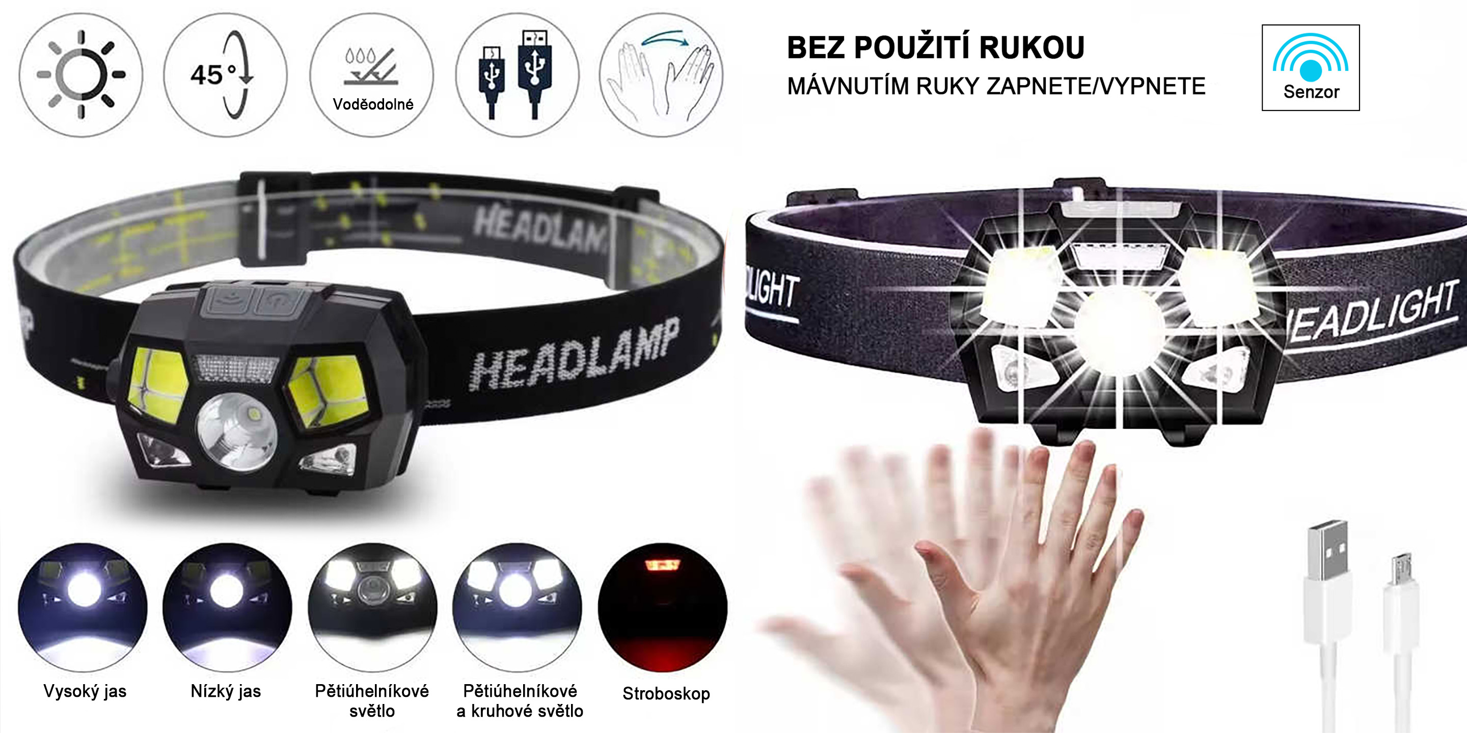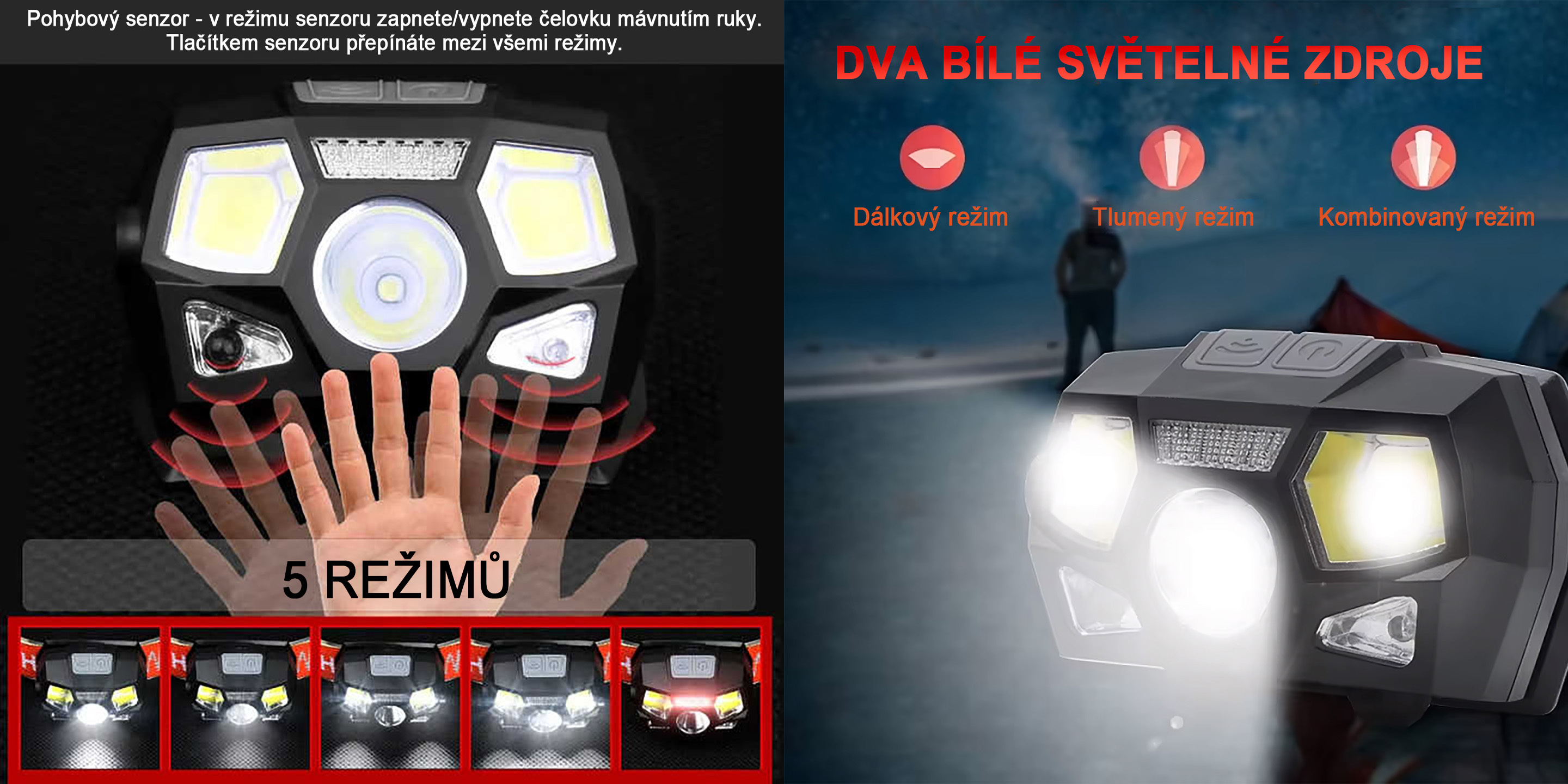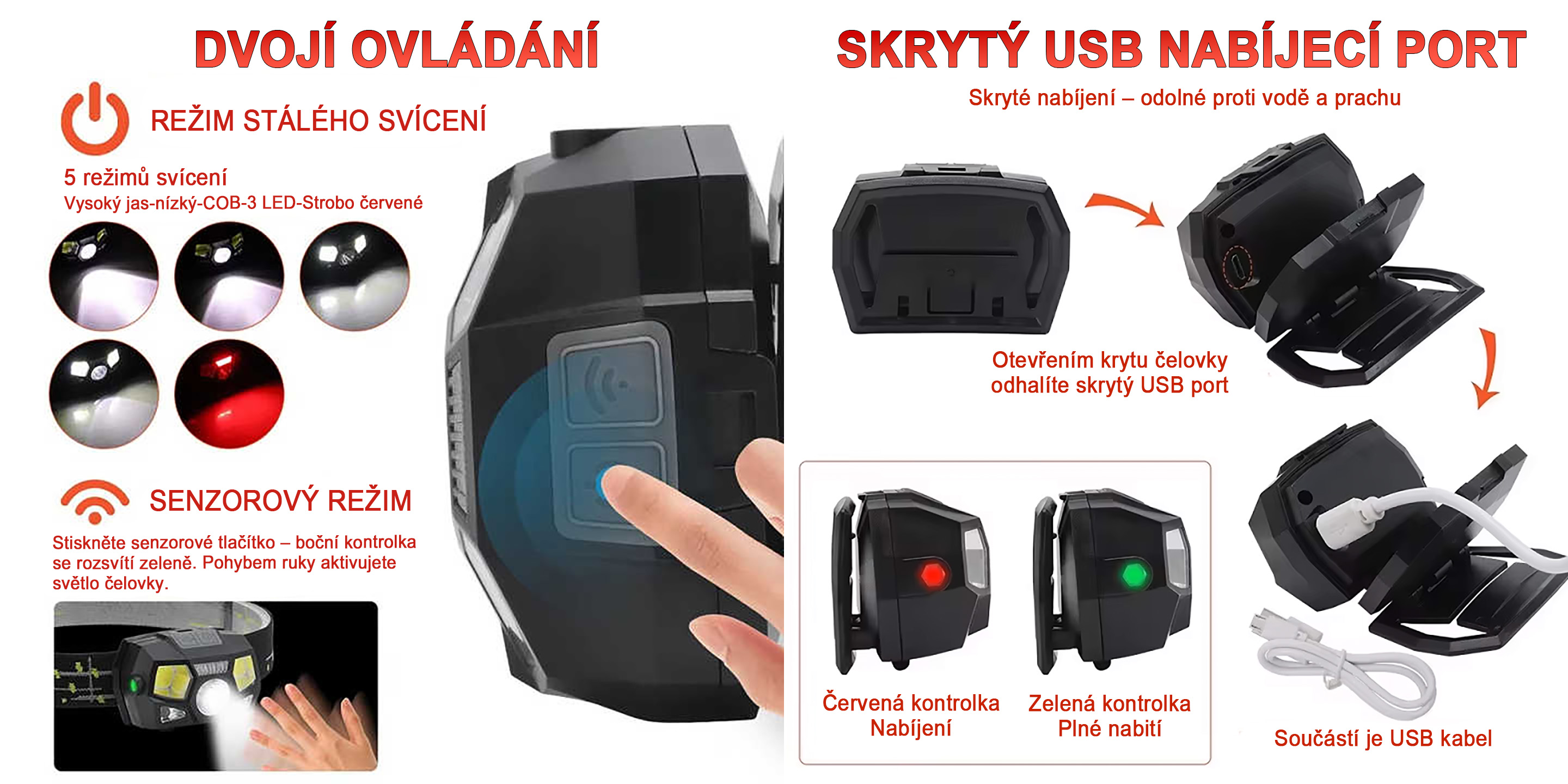 Čelovka umožňuje dvojí ovládání – klasickým tlačítkem pro stálé svícení i aktivací senzorového režimu. K dispozici je 5 režimů svícení: vysoký jas, nízký jas, aktivace bočních COB LED panelů, kombinované světlo a červené stroboskopické světlo. Pod ochranným krytem se nachází skrytý USB nabíjecí port, který je chráněn proti vodě a prachu. Indikace nabíjení probíhá pomocí kontrolky – během dobíjení svítí červeně a po plném nabití zeleně. Součástí balení je USB nabíjecí kabel.