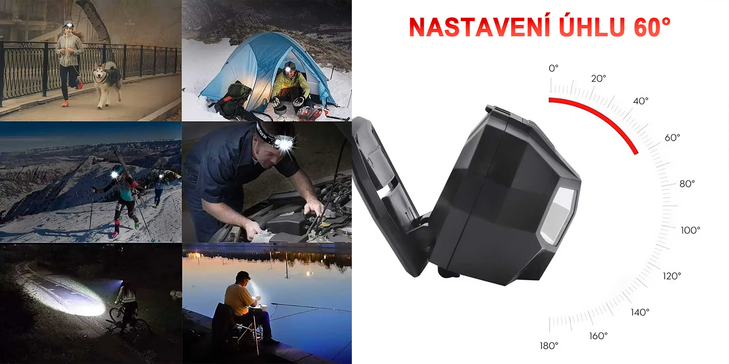 Díky nízké hmotnosti 61 g a kompaktním rozměrům 6,2 × 4,2 × 3,7 cm je čelovka vhodná pro běh, turistiku, kempování, rybaření i práci. Nastavitelný hlavový popruh zajišťuje stabilní a pohodlné uchycení při pohybu. Konstrukce umožňuje nastavení náklonu světla až do úhlu 60°, takže snadno upravíte směr svícení podle potřeby a mechanismus drží zvolenou polohu i při pohybu. Krytí IP65 poskytuje ochranu proti prachu a stříkající vodě a odolné provedení z ABS plastu přispívá k dlouhodobému používání. Vestavěná baterie navíc eliminuje nutnost výměny článků.