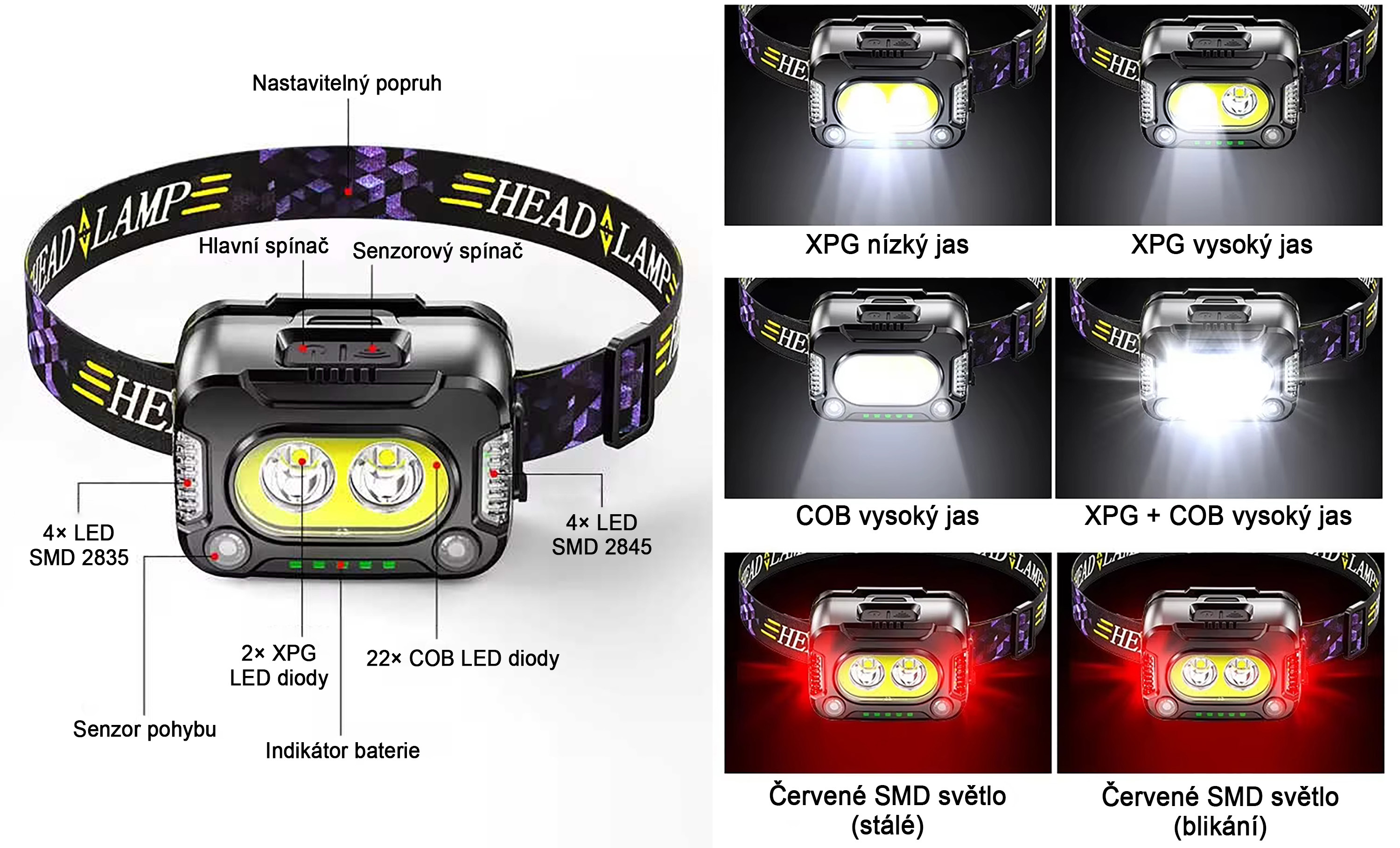 Čelovka disponuje nastavitelným hlavovým popruhem, hlavním i senzorovým spínačem a přehledným indikátorem baterie. Světelný systém tvoří 2× XPG LED, 22× COB LED diod, 4× LED SMD 2835 a 4× LED SMD 2845. K dispozici je šest režimů – nízký a vysoký výkon XPG, vysoký výkon COB, kombinovaný vysoký režim XPG + COB a dvě varianty červeného světla (stálé a blikání). Tato variabilita umožňuje přizpůsobit světlo přesně aktuálním potřebám.