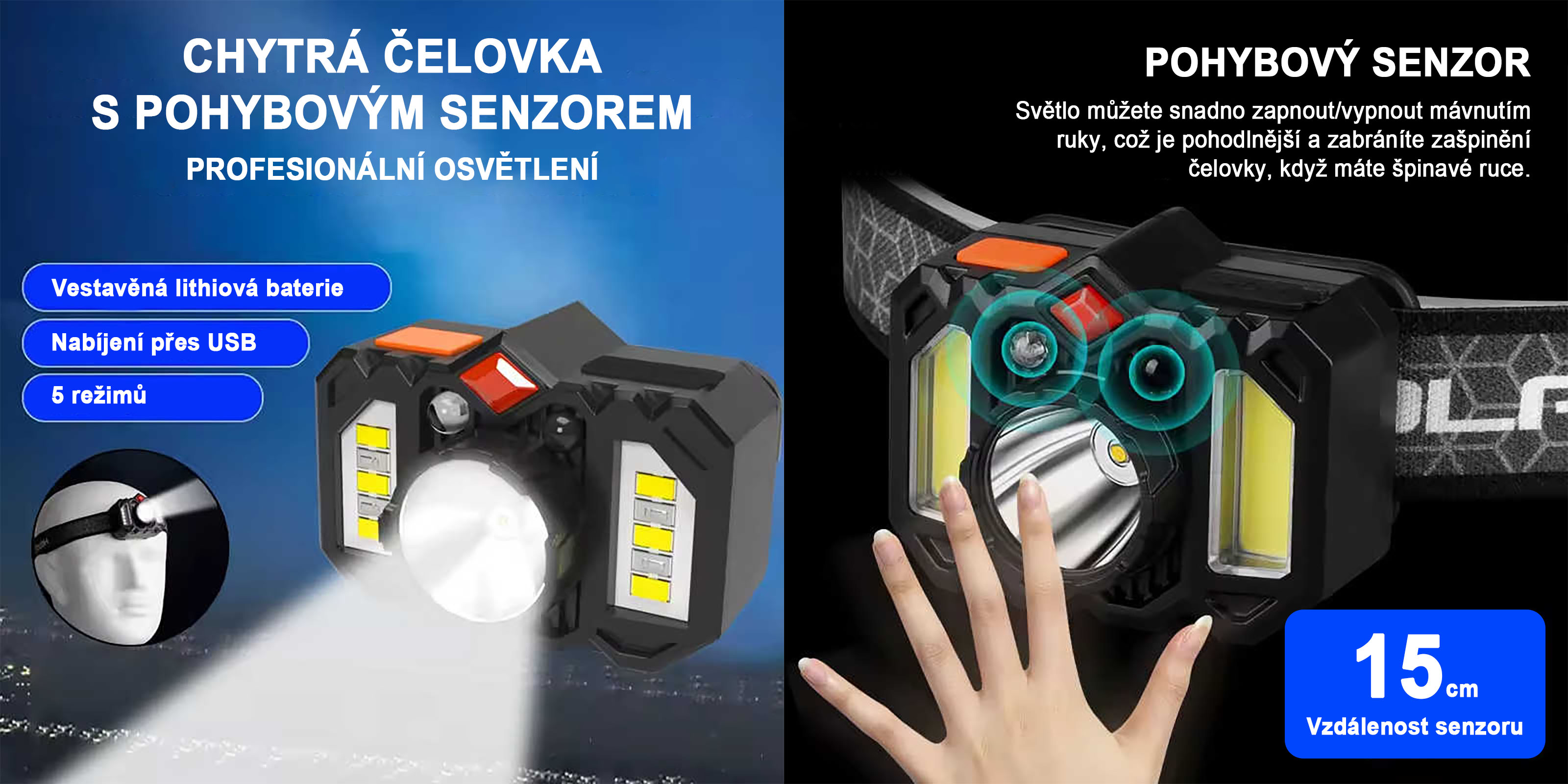 Integrovaný pohybový senzor umožňuje zapnutí a vypnutí pouhým mávnutím ruky. Dosah senzoru je až 15 cm, což zajišťuje rychlou a přesnou reakci. Ovládání bez kontaktu je praktické zejména při sportu nebo práci se znečištěnýma rukama. Řešení přináší vyšší komfort i hygienu používání. Čelovku tak ovládáte snadno a okamžitě.