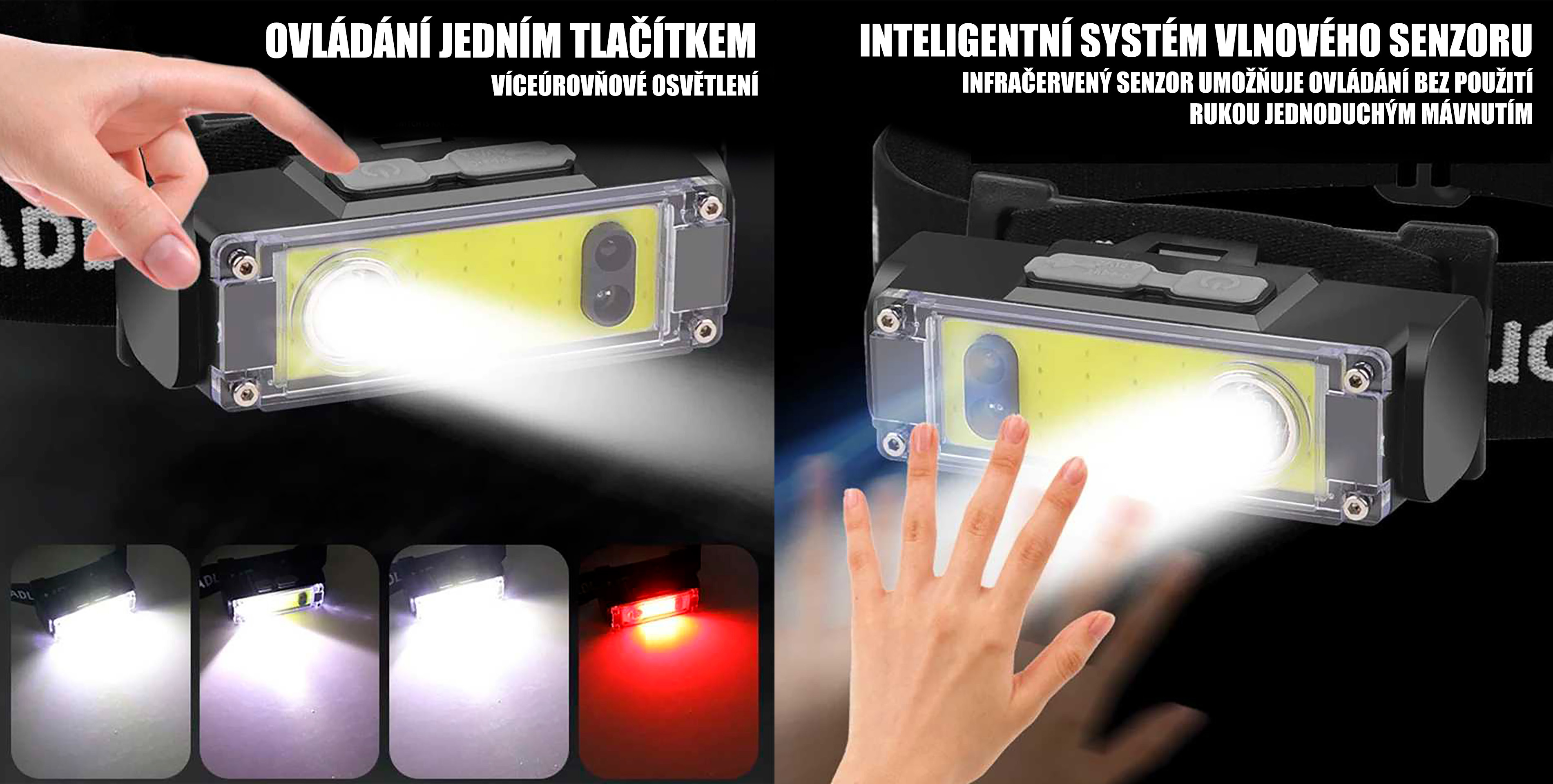 Čelovka umožňuje klasické ovládání pomocí horního tlačítka s více úrovněmi svícení. Současně je vybavena infračerveným senzorem, který reaguje na pohyb ruky před světlem. Díky tomu lze světlo zapnout nebo vypnout bez dotyku. K dispozici je celkem 6 režimů svícení, včetně červeného světla pro specifické situace. Ovládání je rychlé a přizpůsobitelné aktuálním potřebám.