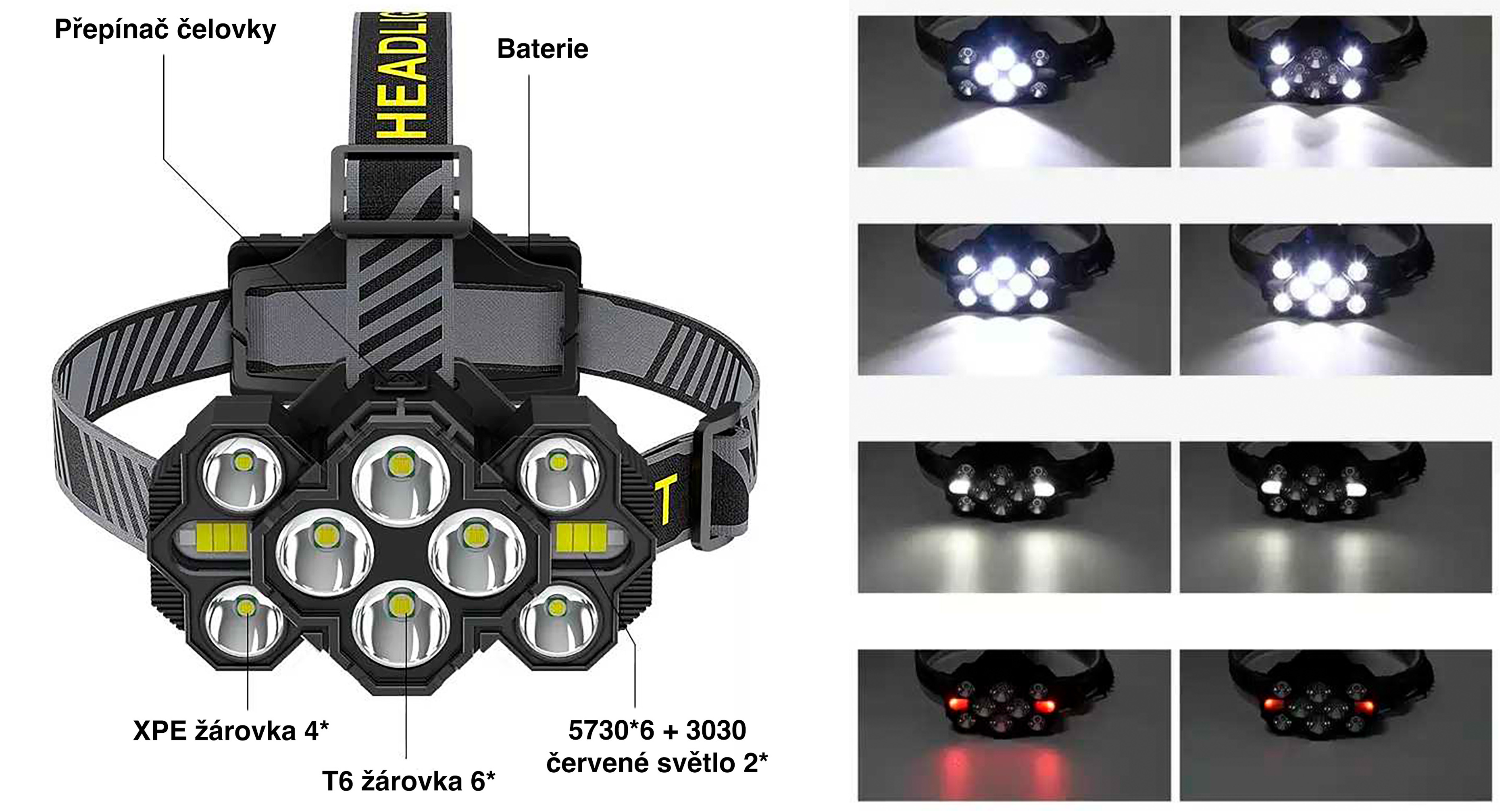 Čelovka je vybavena kombinací 4× XPE, 6× T6 a 2× červeného světla typu 5730 + 3030, což dohromady vytváří celkem 10 světelných zdrojů. Díky této konfiguraci dosahuje výkonu až 2000 lumenů. K dispozici je více režimů intenzity i barev svícení včetně červeného výstražného světla. Integrovaný přepínač umožňuje rychlé přepínání mezi jednotlivými režimy. Konstrukce je navržena pro stabilní upevnění na hlavě.