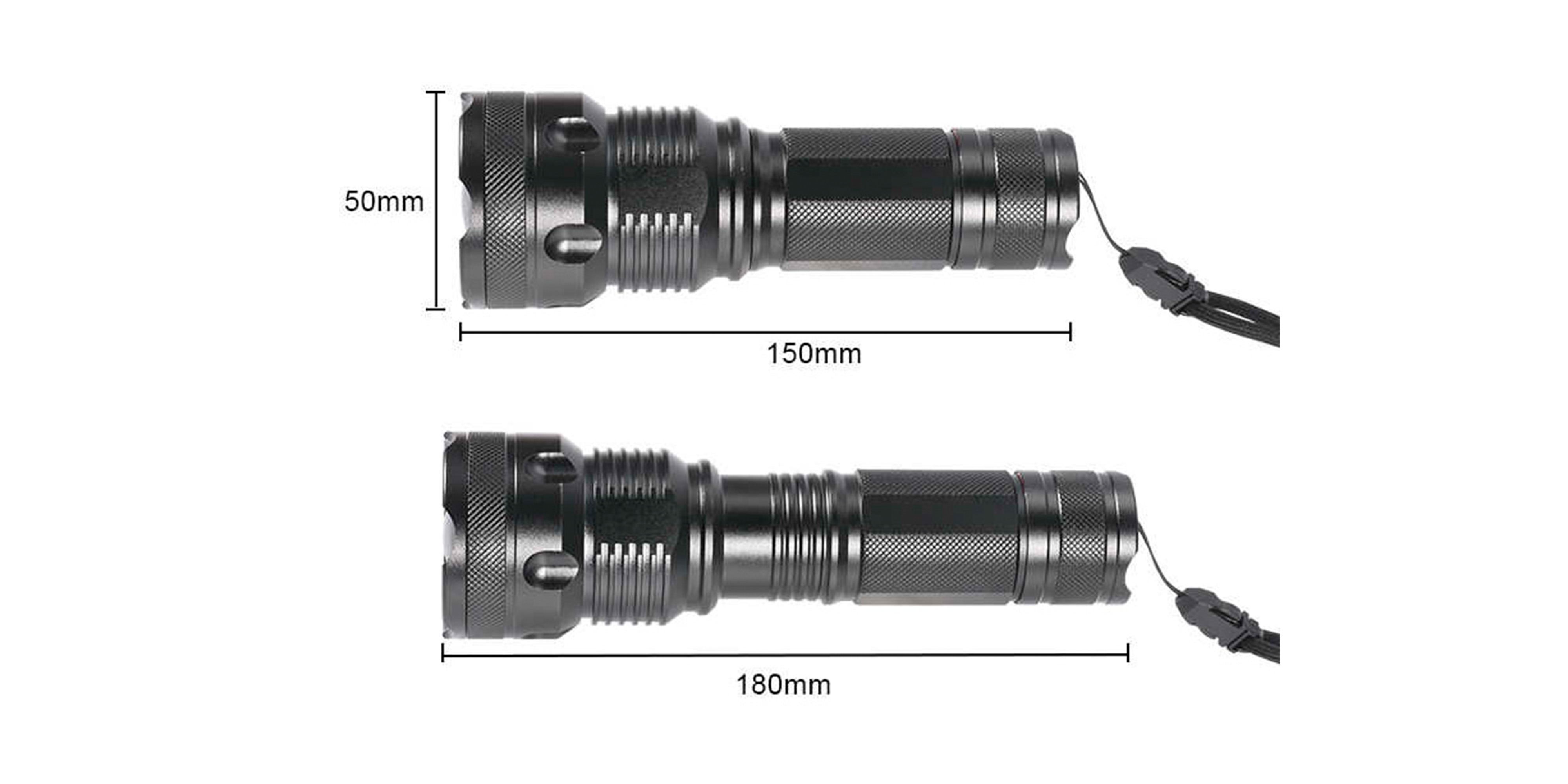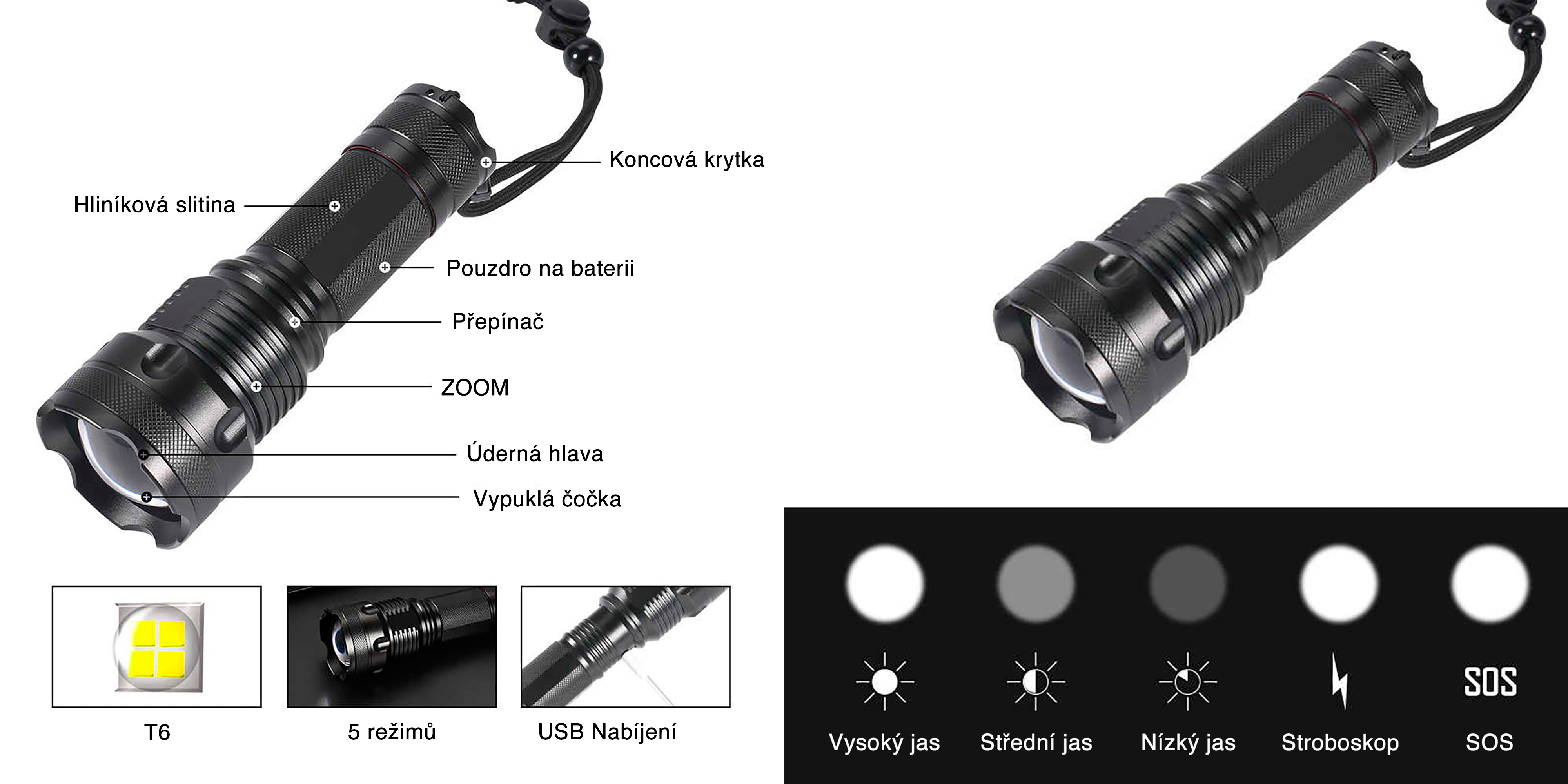 Tělo svítilny je vyrobeno z hliníkové slitiny a doplněno o koncovou krytku pro bezpečné uzavření. Konstrukce obsahuje pouzdro na baterii, ovládací přepínač, funkci ZOOM, pevnou údernou hlavu a vypuklou čočku pro efektivní rozptyl světla. Součástí je LED čip označený jako T6. K dispozici je 5 režimů: Vysoký jas, Střední jas, Nízký jas, Stroboskop a SOS. Označení režimů je přehledně znázorněno ikonami.