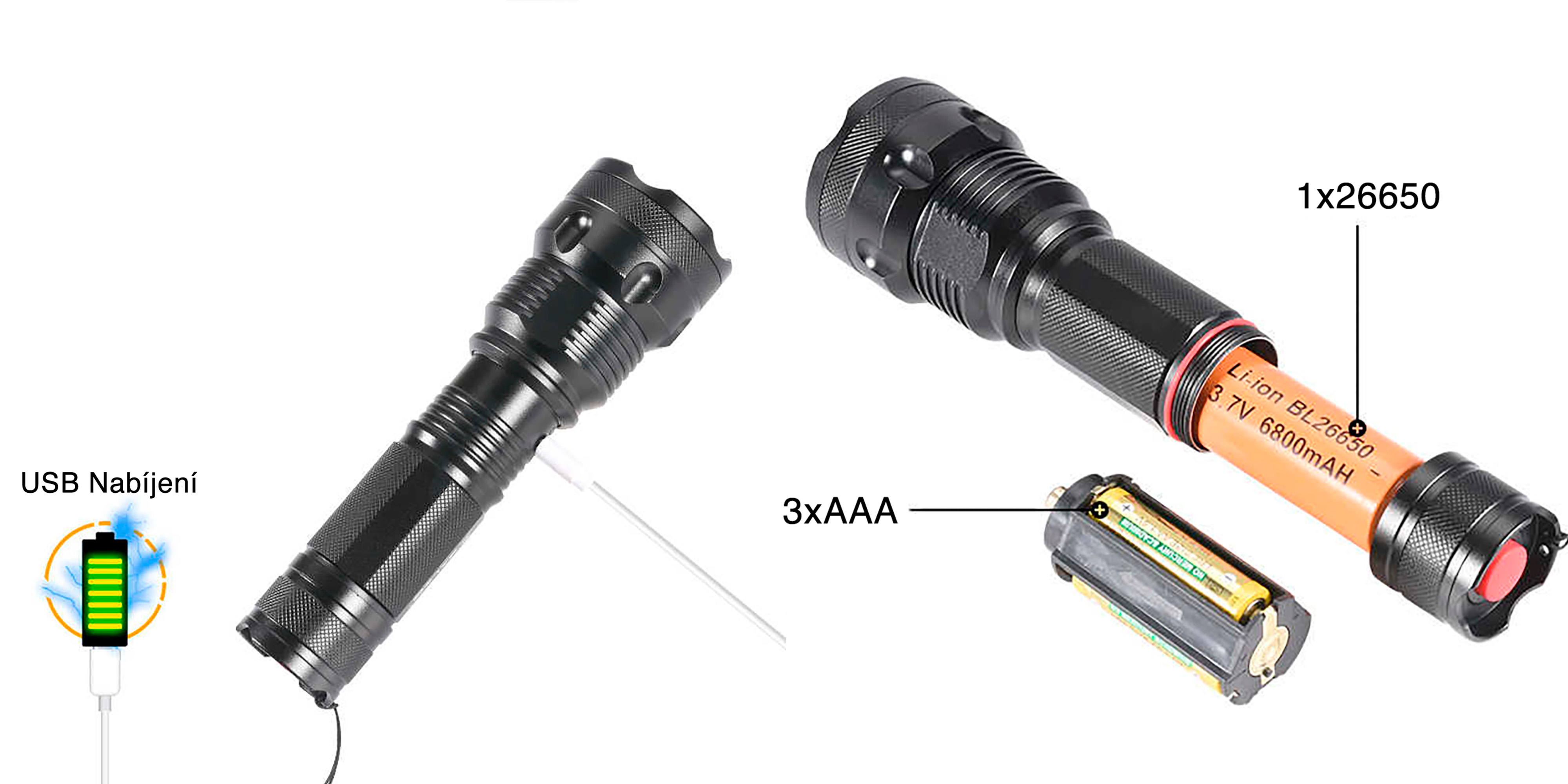 Svítilna podporuje napájení 1× 26650 baterií nebo adaptérem pro 3× AAA baterie. Na baterii je uvedeno označení Li-ion BL26650 3.7V 6800mAh. Nabíjení probíhá přes USB Nabíjení, což umožňuje pohodlné dobíjení pomocí přiloženého micro USB kabelu. Označení 1x26650 a 3xAAA přehledně znázorňuje dostupné varianty napájení.