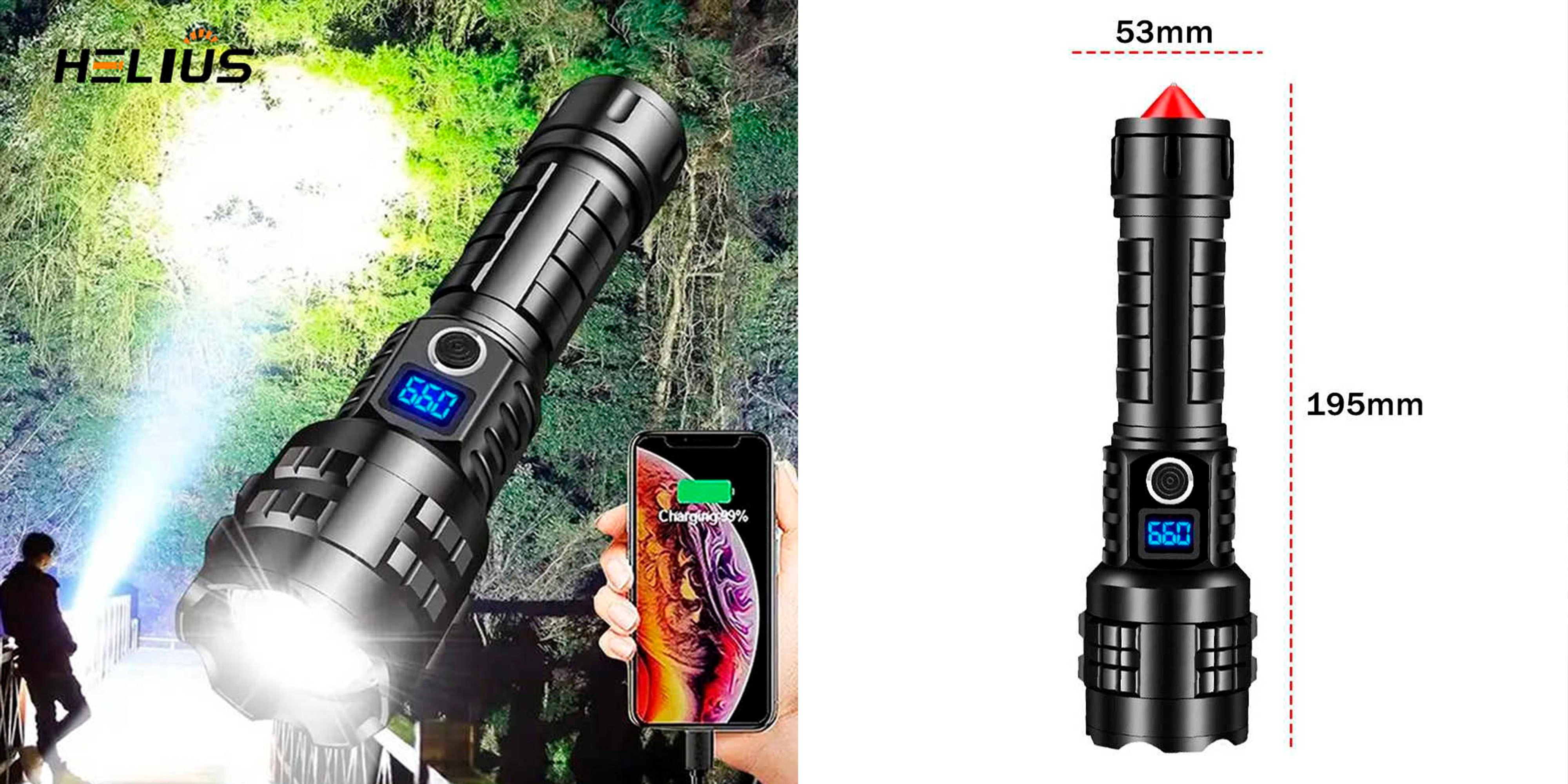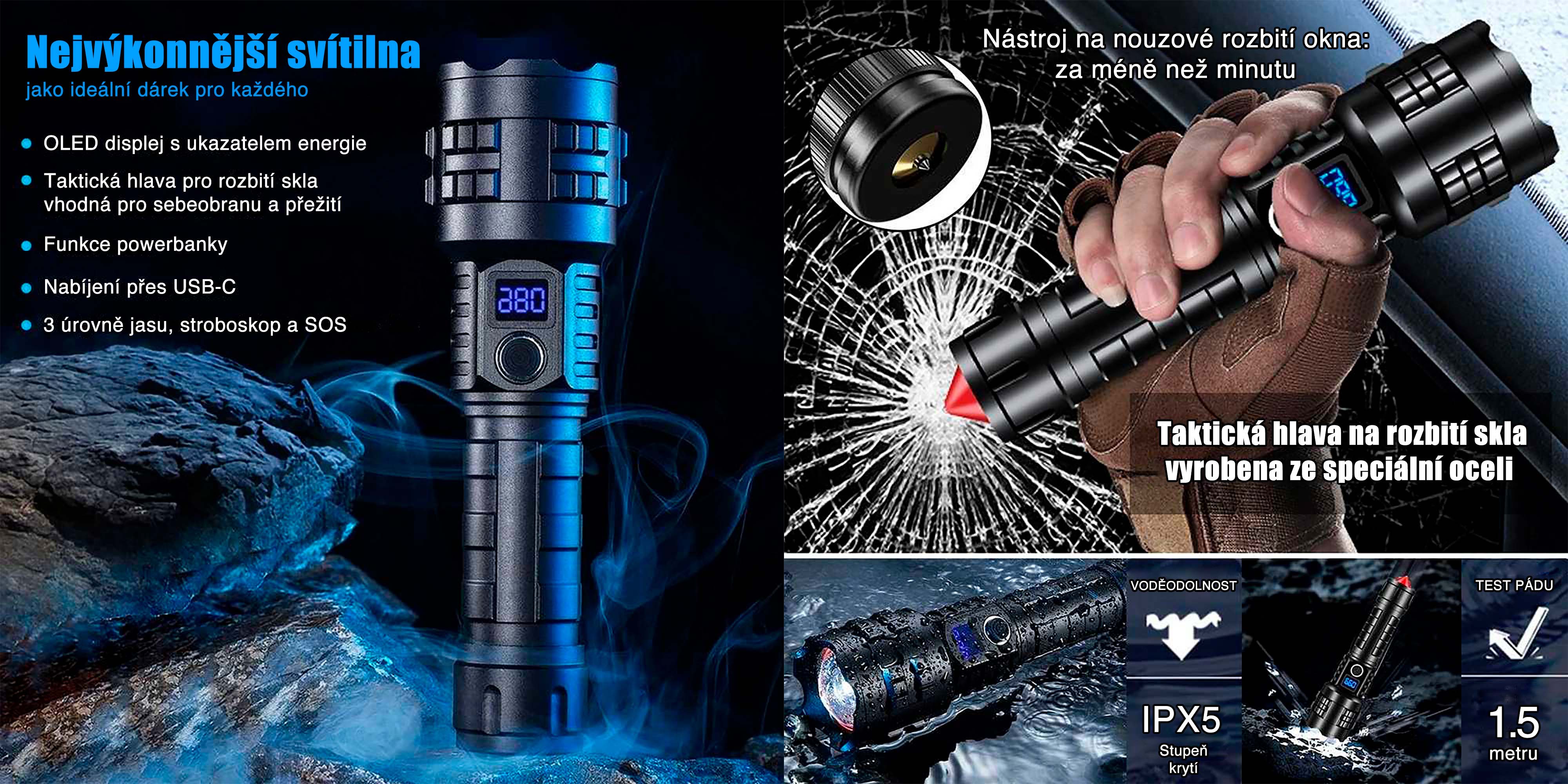 Taktická hlava je vyrobena ze speciální oceli a slouží jako nástroj pro nouzové rozbití okna „za méně než minutu“. Konstrukce je přizpůsobena pro sebeobranu i přežití, jak je uvedeno přímo na vizuálu. Svítilna je zároveň označena jako „Nejvýkonnější svítilna“ a je vybavena OLED displejem s ukazatelem energie. Nechybí ani funkce powerbanky a nabíjení přes USB-C.