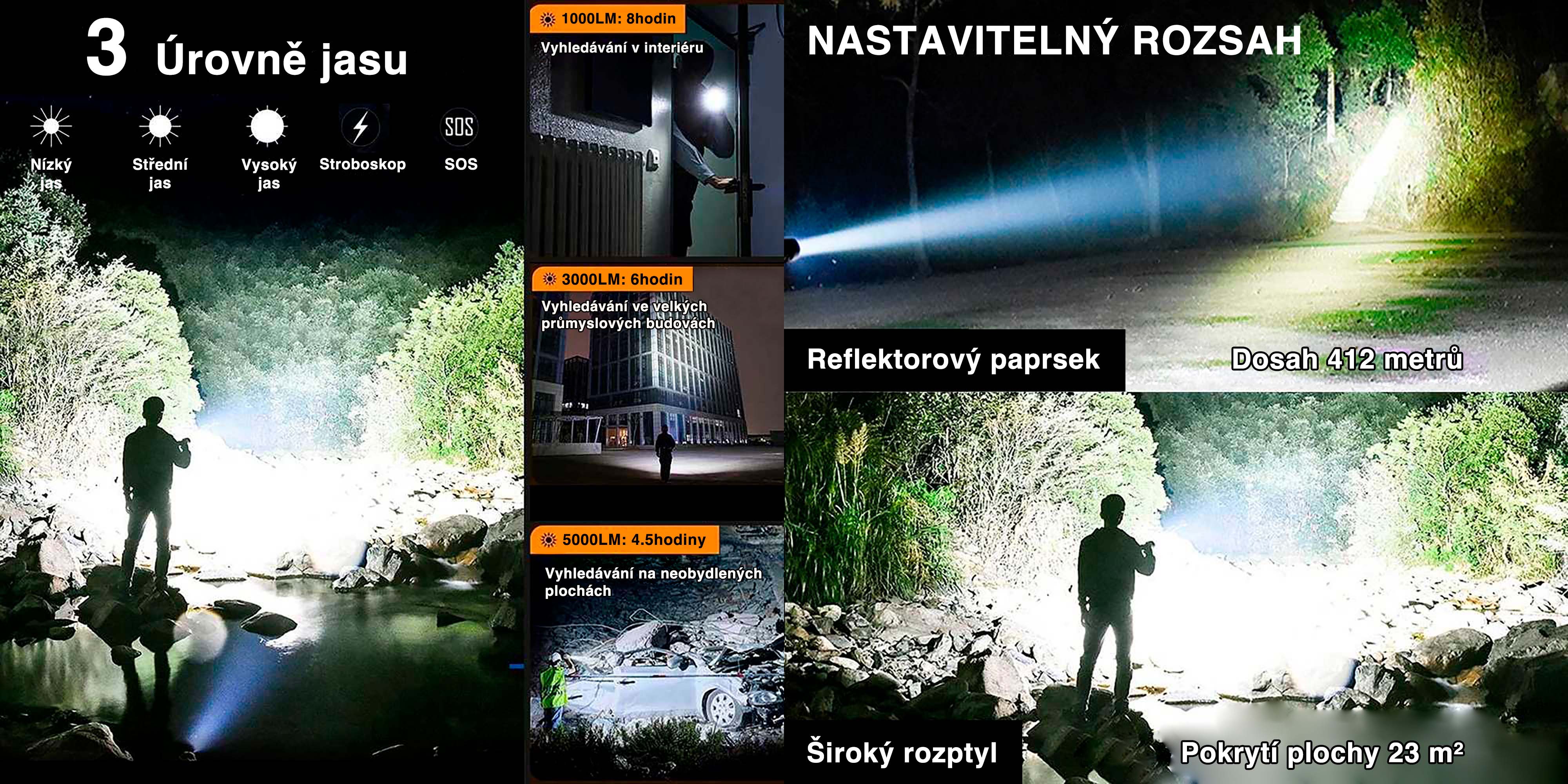 Svítilna nabízí 3 úrovně jasu – nízký, střední a vysoký – doplněné o režim Stroboskop a SOS. Uvedené hodnoty 1000LM (8 hodin), 3000LM (6 hodin) a 5000LM (4.5 hodiny) ukazují různé scénáře použití. Nastavitelný rozsah umožňuje přepínat mezi „Reflektorovým paprskem“ a „Širokým rozptylem“. Dosah světla je až 412 metrů a pokrytí plochy činí 23 m².