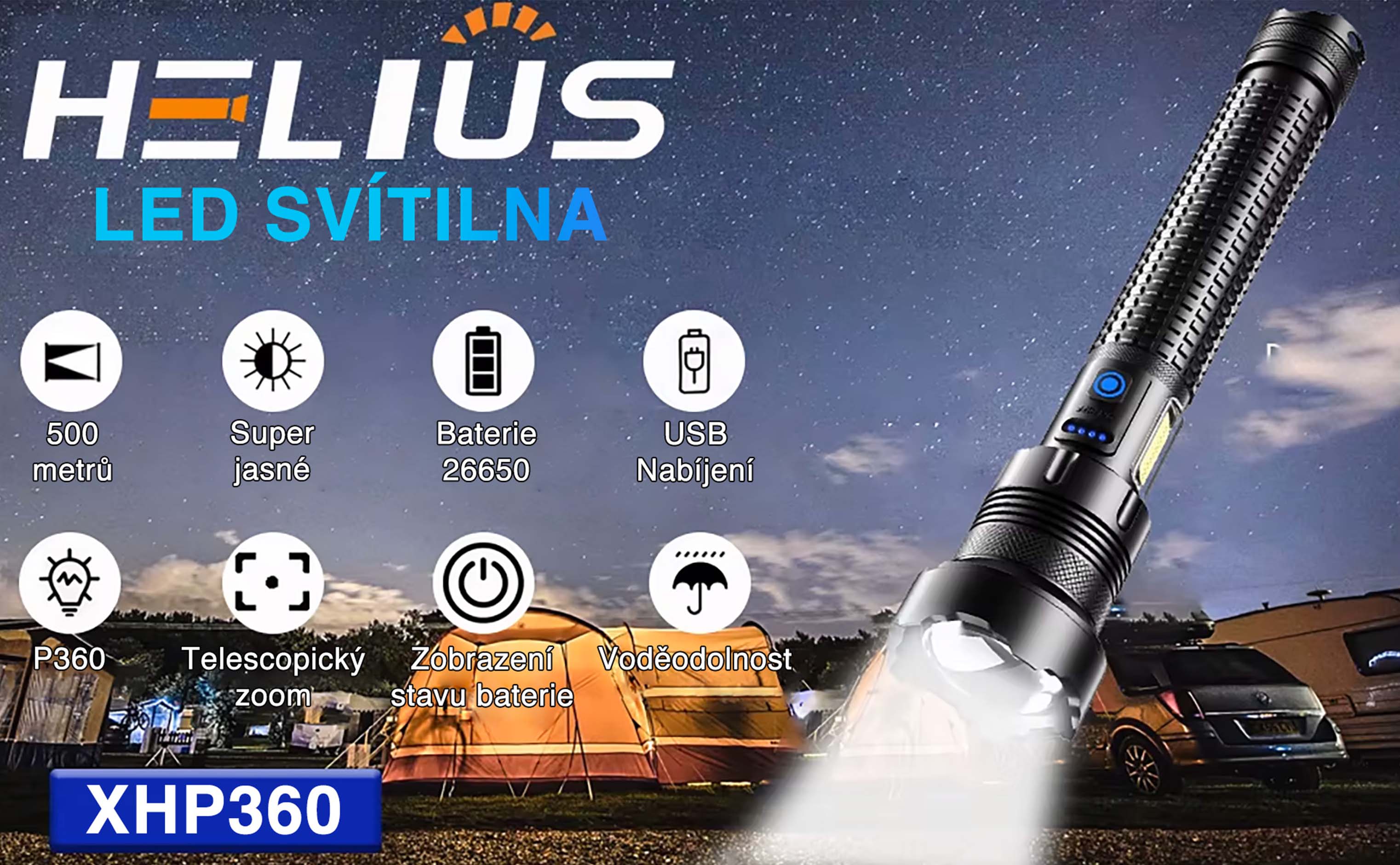 Hlavní vlastnosti modelu XHP360 zahrnují dosvit až 500 metrů, označení „Super jasné“ a napájení baterií 26650. K dispozici je USB nabíjení, funkce P360, teleskopický zoom a zobrazení stavu baterie. Uvedena je také voděodolnost, která rozšiřuje možnosti použití při venkovních aktivitách.