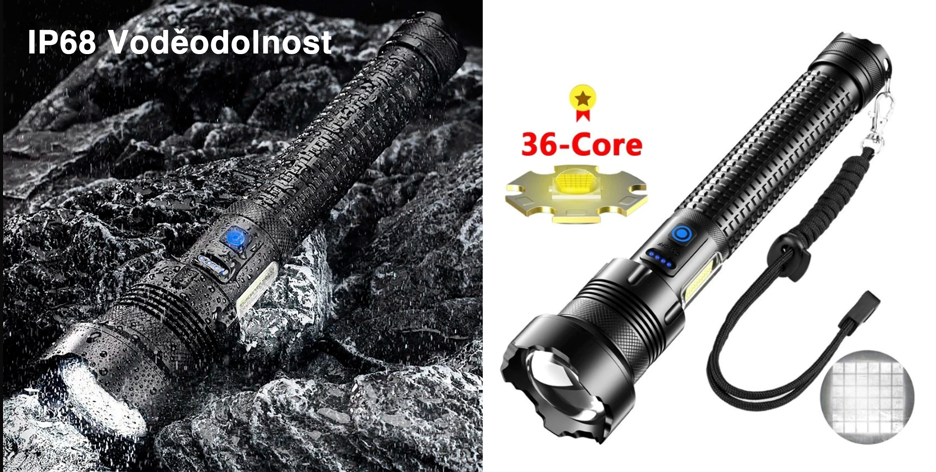Označení „IP68 Voděodolnost“ potvrzuje maximální ochranu proti prachu a možnost úplného ponoření do vody. Konstrukce je přizpůsobena použití v dešti i vlhkém prostředí. Uvedené označení „36-Core“ odkazuje na typ použitého světelného čipu. Součástí je také poutko na ruku a detailní zobrazení struktury LED prvku.