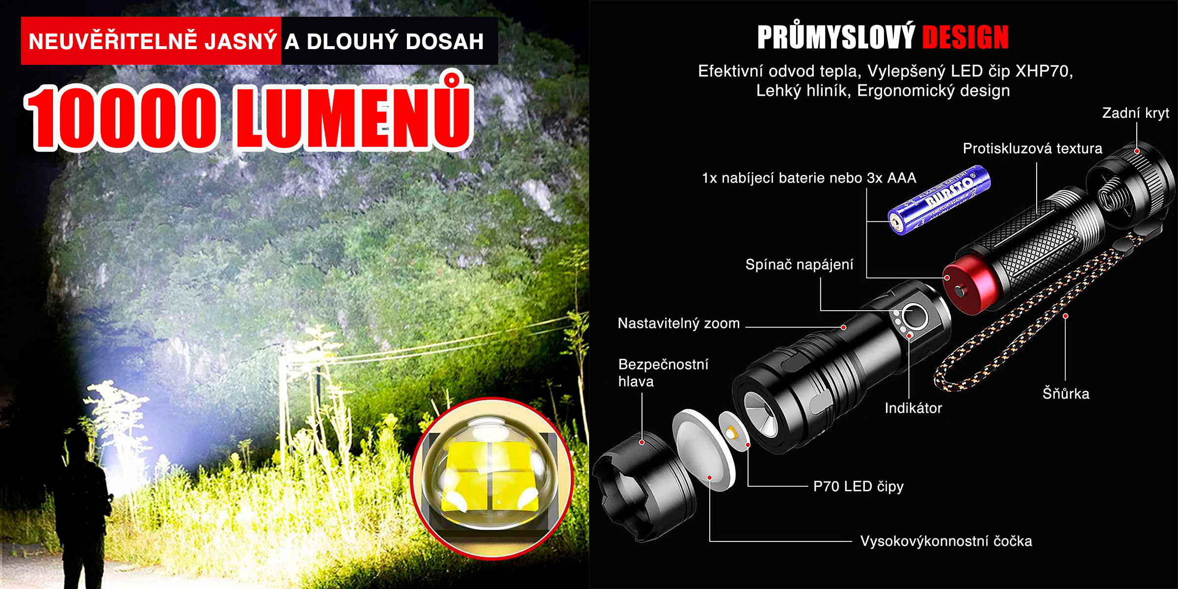 Svítilna dosahuje výkonu 10000 lumenů a nabízí „neuvěřitelně jasný a dlouhý dosah“. Je vybavena vylepšeným LED čipem XHP70 (P70 LED čipy) a vysokovýkonnostní čočkou pro silný světelný kužel. Konstrukce z lehkého hliníku podporuje efektivní odvod tepla a ergonomické držení. Nechybí nastavitelný zoom, bezpečnostní hlava, protiskluzová textura rukojeti ani praktická šňůrka. Napájení je možné 1× baterií nebo 3× AAA dle vyobrazení.