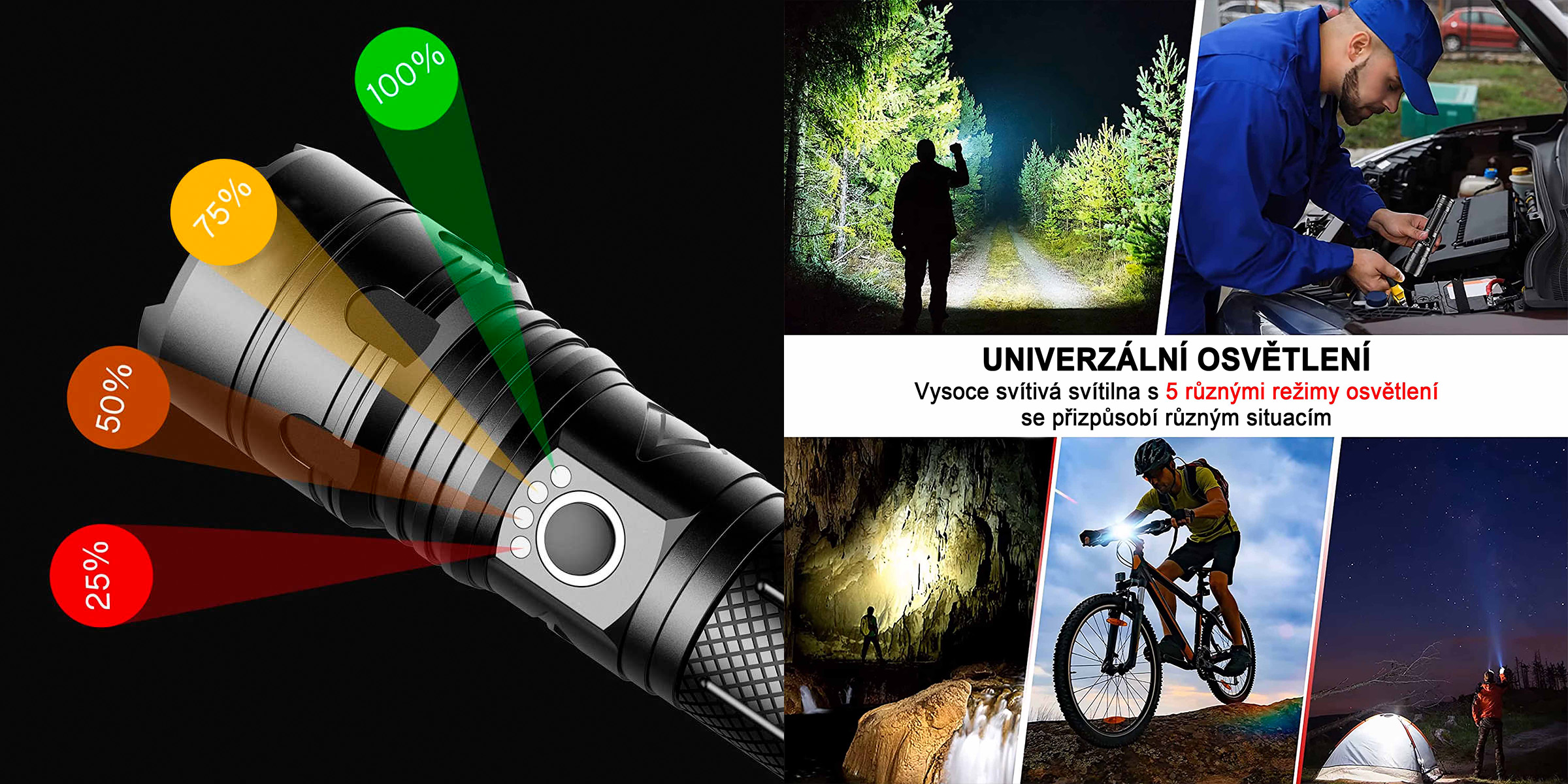Fotografie zobrazuje čtyři úrovně svítivosti 25 %, 50 %, 75 % a 100 %, přičemž svítilna nabízí celkem 5 různých režimů osvětlení. Díky tomu je vhodná pro noční procházky, kempování, práci u auta i pohyb v terénu. Univerzální osvětlení se přizpůsobí různým situacím podle aktuální potřeby světelného výkonu. Ovládání režimů je řešeno tlačítkem na těle svítilny. Variabilita výkonu zároveň pomáhá optimalizovat dobu svícení.
