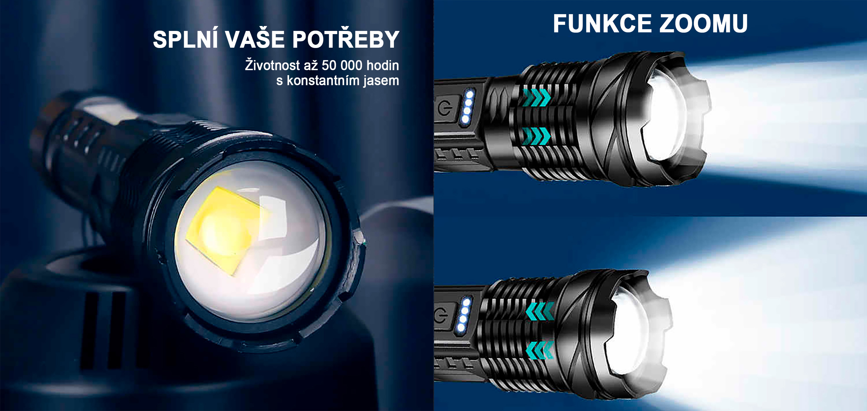 Možnost plynulé změny šířky paprsku umožňuje přizpůsobit osvětlení aktuálním potřebám. Lze přejít od širokého rozptylu světla po úzký koncentrovaný paprsek pro delší dosah. Ovládání je rychlé a intuitivní.