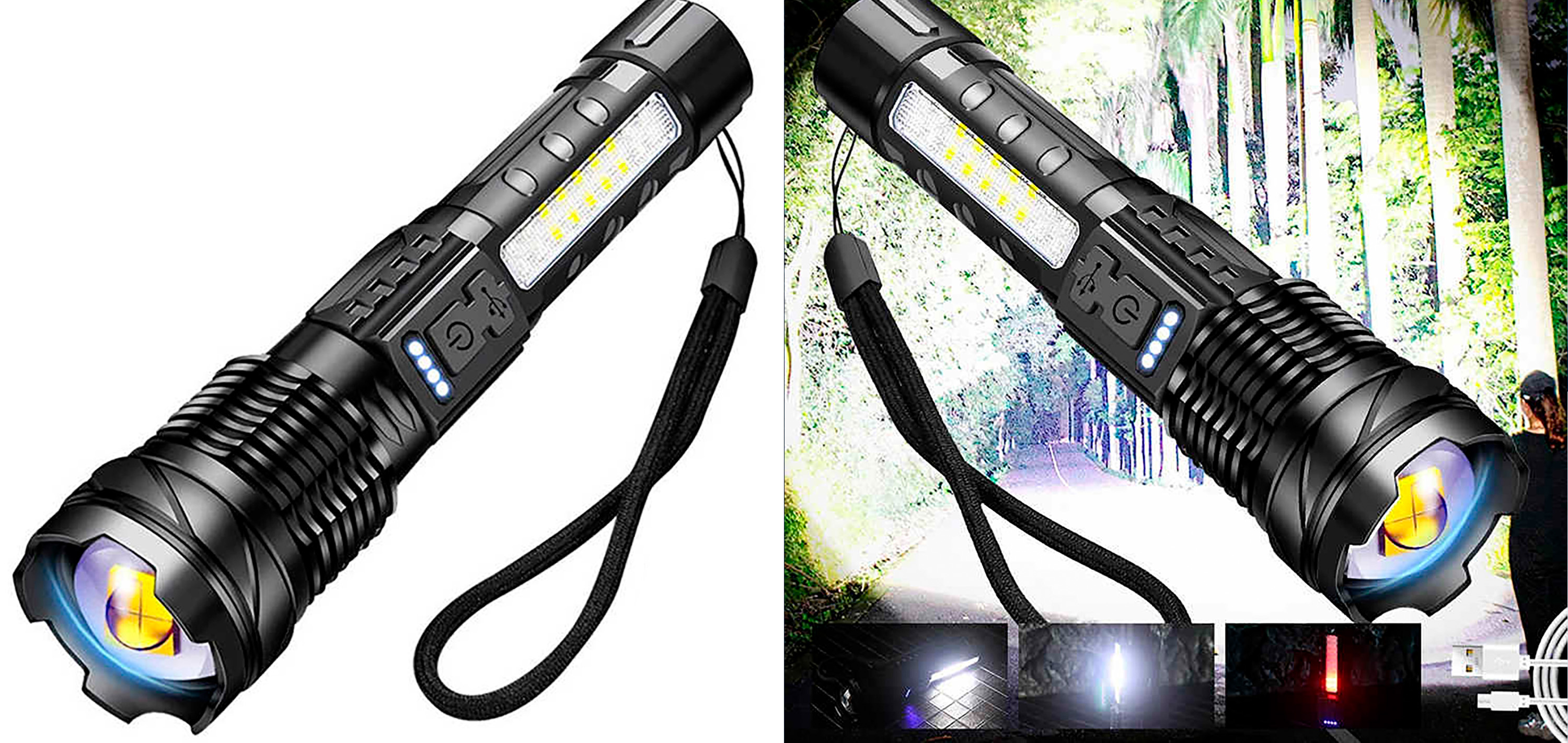 Boční panel doplňuje hlavní reflektor o další zdroj světla pro širší využití. Pevné tělo z hliníkové slitiny zajišťuje odolnost při zachování hmotnosti 500 g. Krytí IP65 poskytuje ochranu proti prachu a stříkající vodě. Ergonomický tvar podporuje jistý úchop i při náročnějším použití.