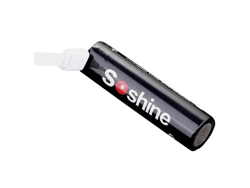 Nabíjecí baterie Soshine 18650 mAh s vlastním nabíjecím mikro USB konektorem. Lze ji nabíjet připojením kabelu do micro-USB konektoru (např. z počítače či nabíječkou na mobilní telefon) tak i v klasické nabíječce. Li-ion nabíjecí baterie se vyznačují velmi vysokou kapacitou, netrpí paměťovým efektem a ani samovybíjením. Li-ion ve velikosti 18650 jsou nejlepší volbou z hlediska uchované energie vzhledem k rozměrům a váze akumulátoru. Přidané elektronické obvody zabraňují přebití článku, jeho přílišnému vybití a proti zkratu či příliš vysokému proudovému odběru. Pokud elektronika baterie vyhodnotí dosažení limitních hodnot, bezpečně odpojí článek. Interní ochrana sestává ze separátoru, ochrany proti přehřátí (PTC thermal protection) a speciálního protivýbuchového ventilu.