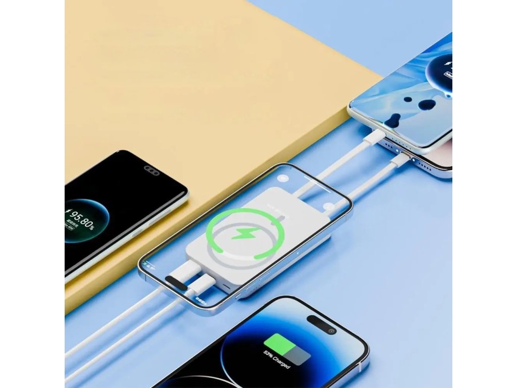 Silný magnet spolehlivě přichytí powerbanku k telefonu, ať už jste doma, venku nebo na cestách. Podporuje rychlé kabelové i bezdrátové nabíjení, takže energii doplníte pohodlně a bezpečně kdykoliv během dne.