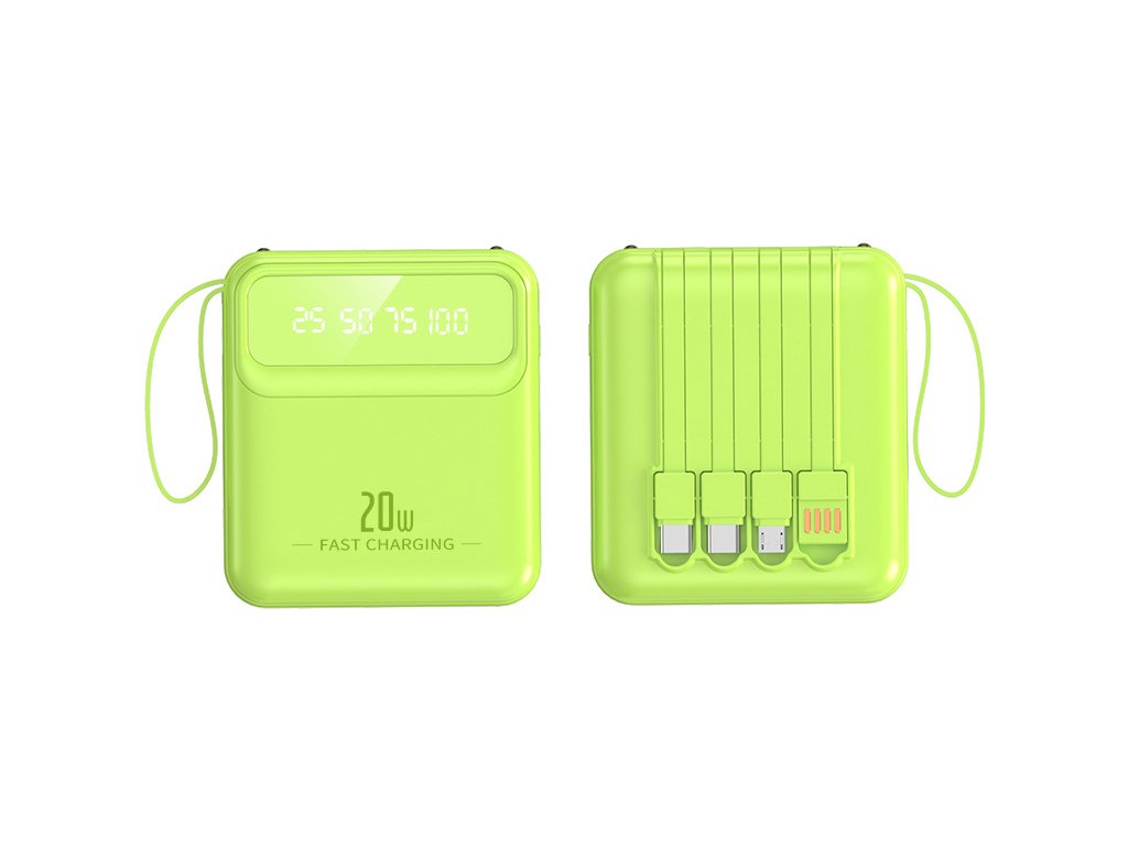 Tato kompaktní powerbanka s kapacitou 5000 mAh nabízí praktické a okamžitě použitelné řešení nabíjení na cestách. Díky čtyřem vestavěným kabelům, rychlému 20W výstupu, LED displeji a nouzové svítilně je ideálním doplňkem pro každodenní použití.