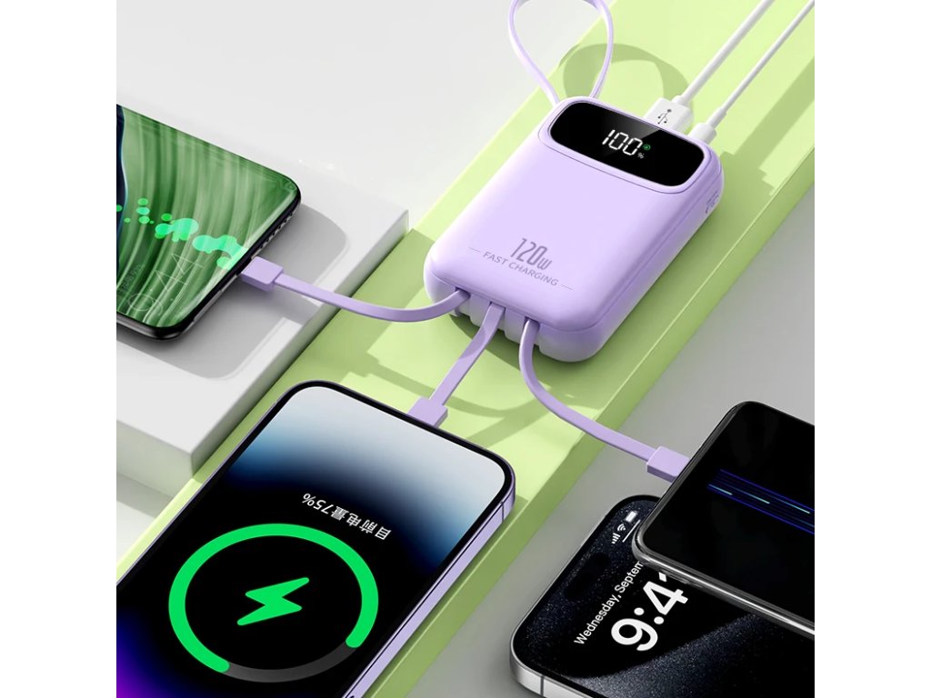Podpora rychlého nabíjení až 120 W a PD 20 W umožňuje efektivní doplnění energie kompatibilních zařízení v krátkém čase. Powerbanka je vhodná pro moderní smartphony, tablety i další elektroniku a poskytuje stabilní výkon i při současném nabíjení více zařízení.