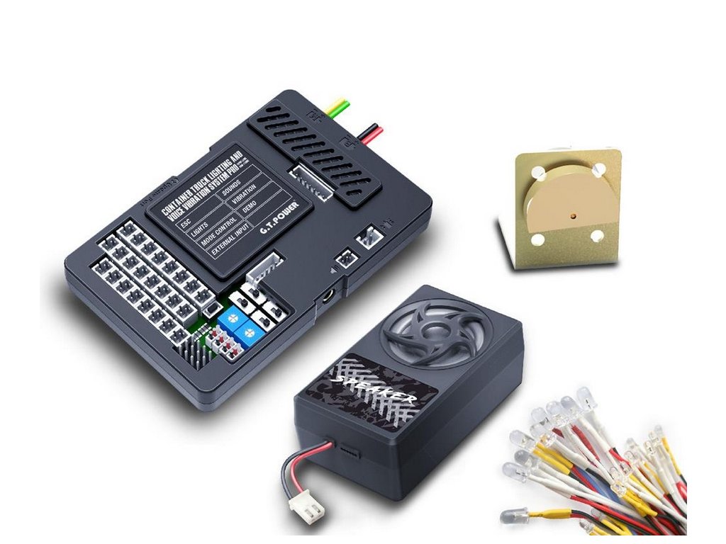 Světelný, zvukový a vibrační systém GT Container Truck GT-171 .Jedná se o výkonný systém osvětlení a hlasových vibrací pro 4wd Tamiya RC tahač od společnosti GTPower, který poskytuje spoustu zvukových efektů, jako je spuštění, volnoběh, brzda atd. Je vybaven připojením Bluetooth, takže všechny funkce lze nastavit pomocí Smart telefonu. ESC je integrováno do tohoto systému, takže nepotřebujete externí ESC a podporuje většinu lithiových baterií na trhu. Systém je dodáván s reproduktorem, LED světly a vibračním motorem a umožňuje vám užít si další aspekt zážitku z jízdy RC kamionu.