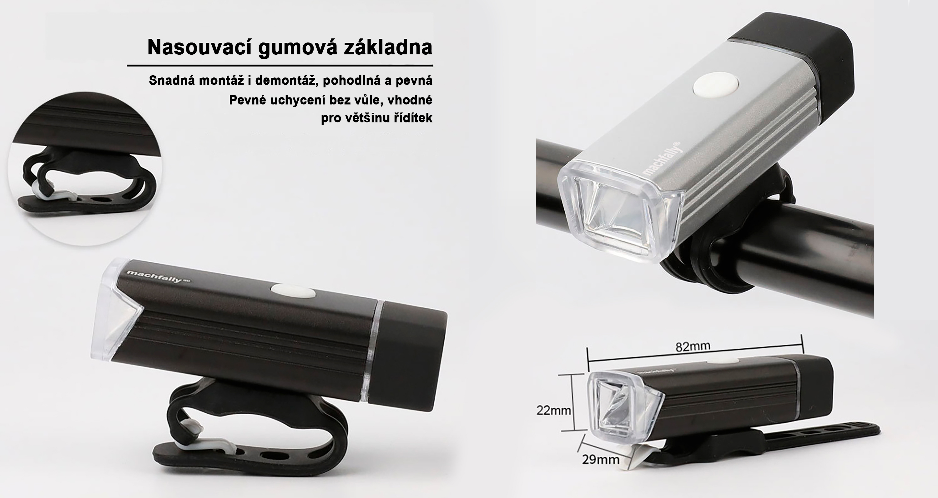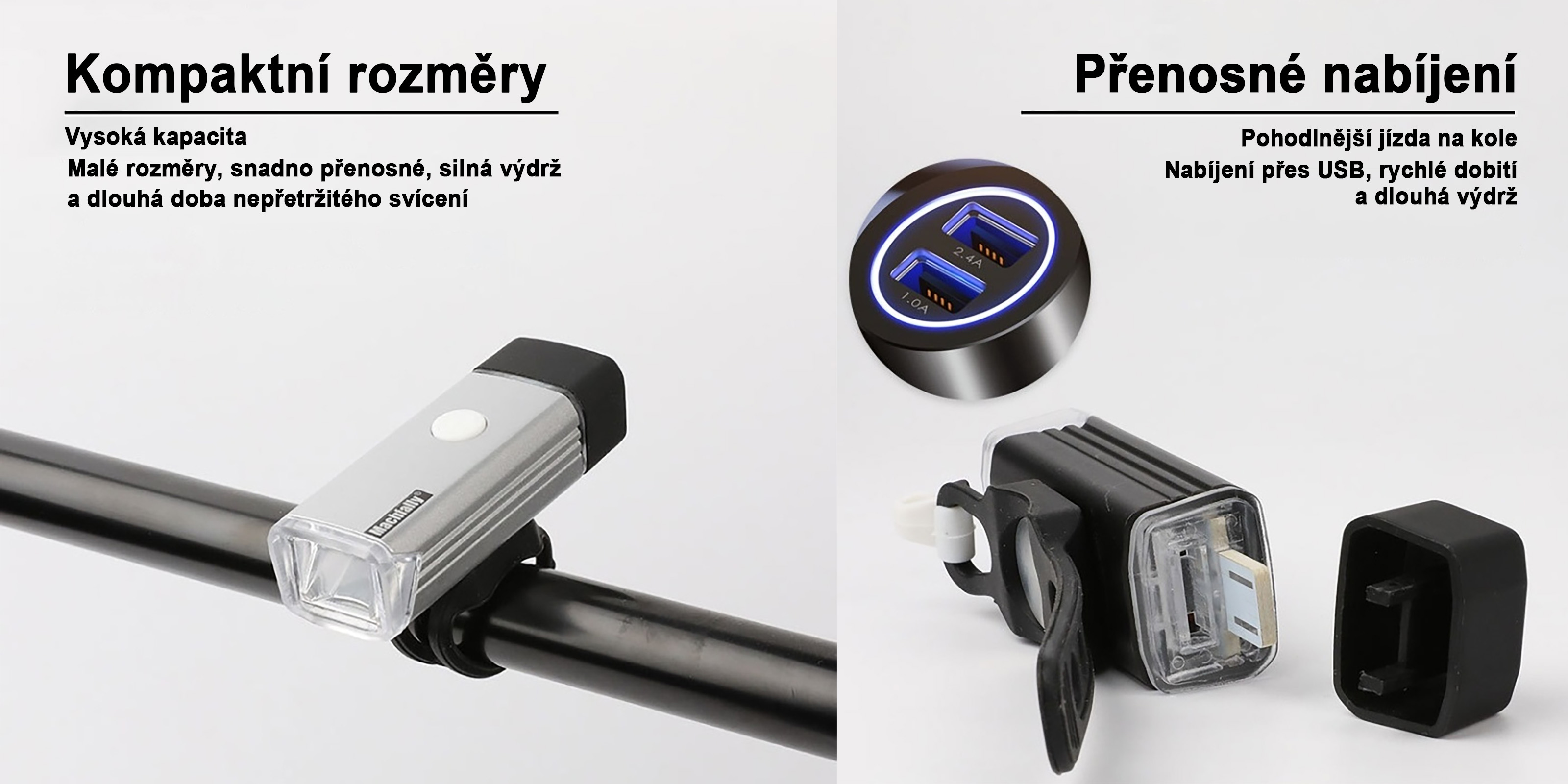 Rozměry 8,2 × 2,9 × 2,2 cm zajišťují snadné umístění na řídítka bez zbytečné zátěže prostoru. Nízká hmotnost 65 gpřispívá k pohodlnému používání i při delších jízdách. Integrované USB nabíjení umožňuje jednoduché a rychlé doplnění energie bez výměny baterií. Praktické řešení pro každodenní provoz.