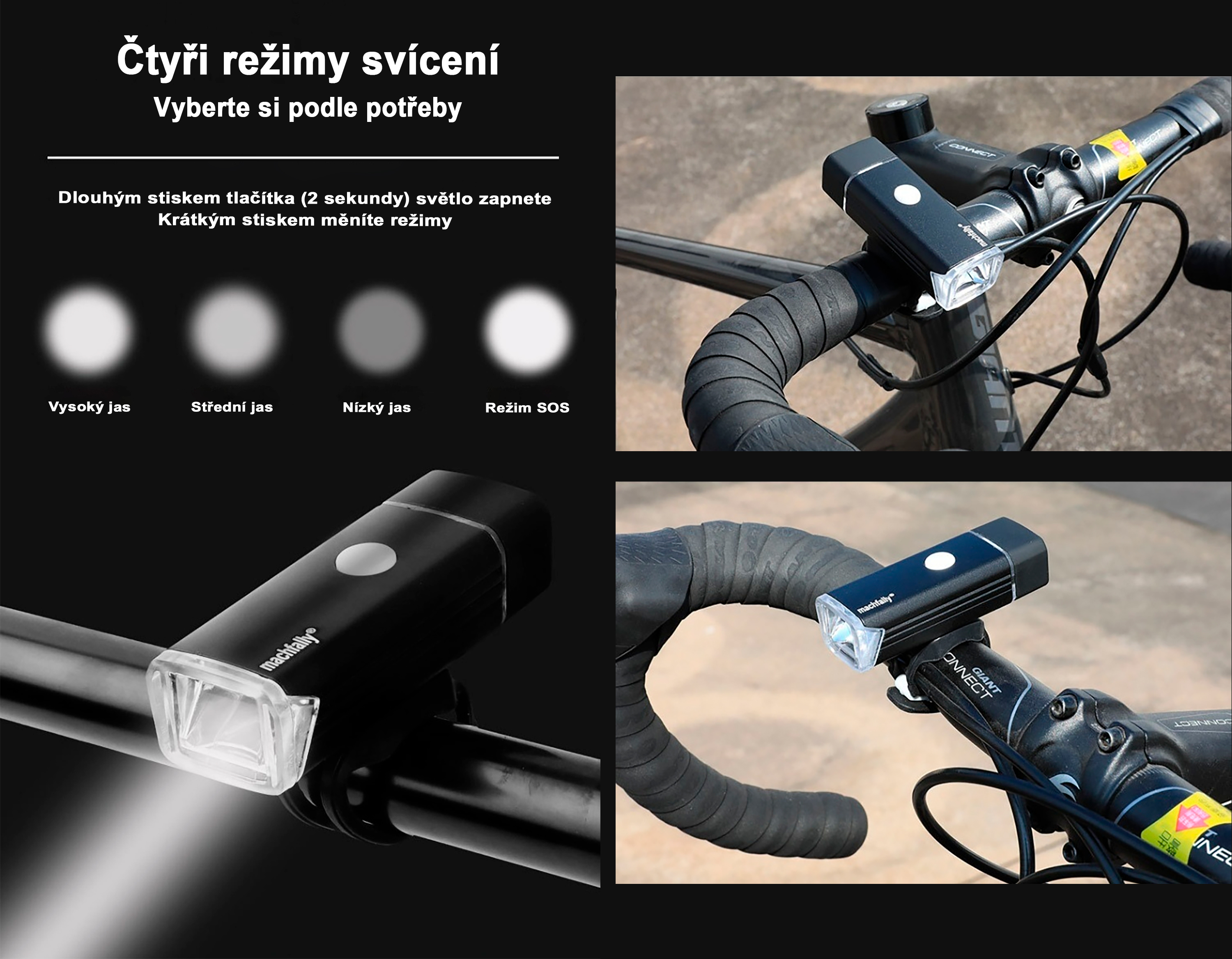 K dispozici jsou 4 režimy svícení – vysoký, střední, nízký a SOS režim. Ovládání probíhá jedním tlačítkem s funkcí delšího stisku pro zapnutí a krátkého stisku pro změnu režimu. Světlo je pevně uchyceno na řídítkách a drží stabilně i během jízdy. Vhodné pro většinu typů řídítek.