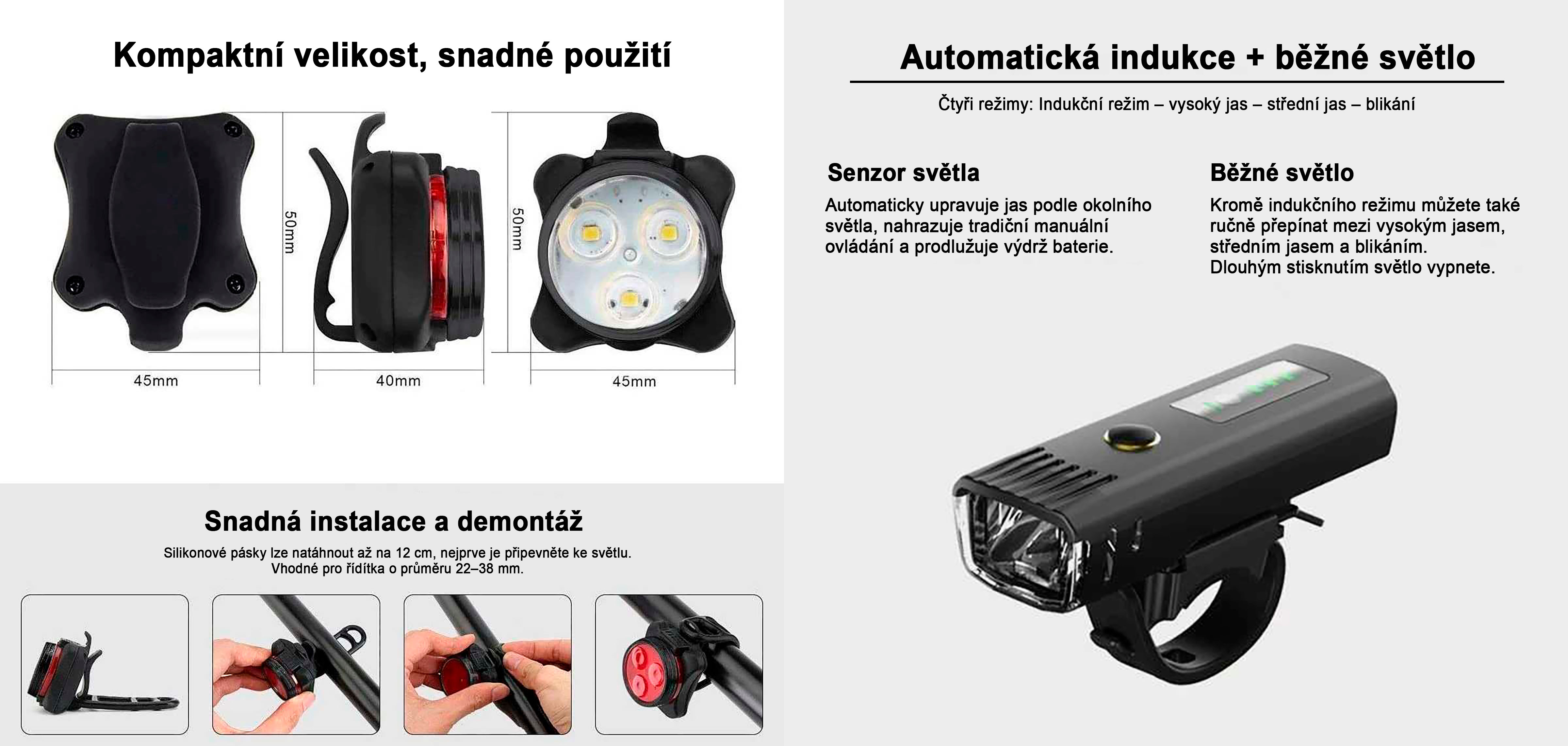 - Kompaktní design pro snadnou montáž na kolo nebo koloběžku.