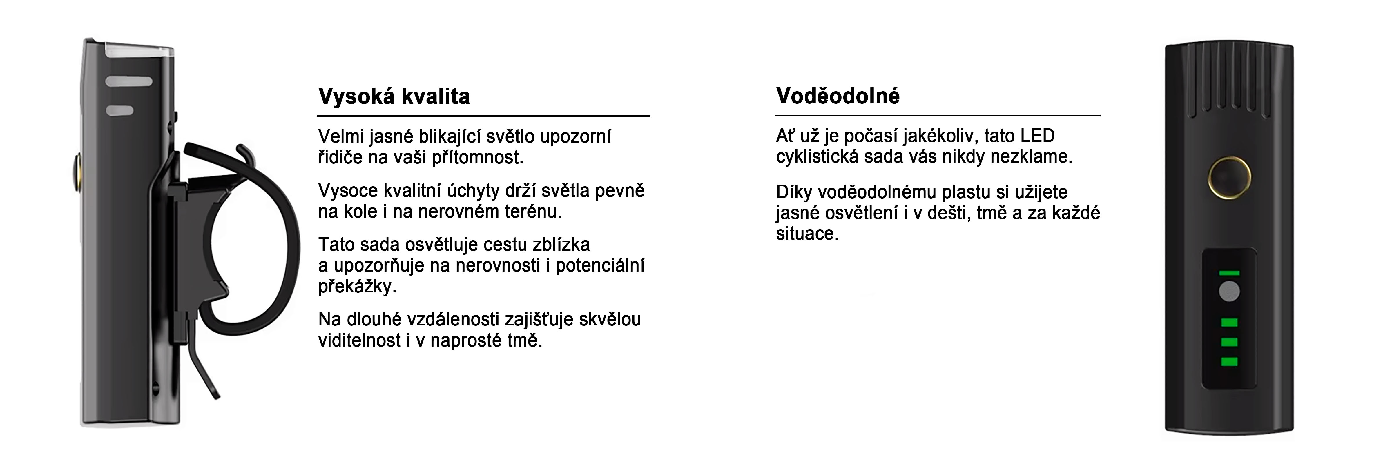 Tělo je vyrobeno z ABS plastu, který zajišťuje pevnost a dlouhou životnost. Stabilní uchycení drží světlo pevně i při jízdě na nerovném povrchu. Krytí IP55 chrání proti prachu i stříkající vodě, takže je vhodné i do deště. Konstrukce je navržena pro pravidelné venkovní používání.