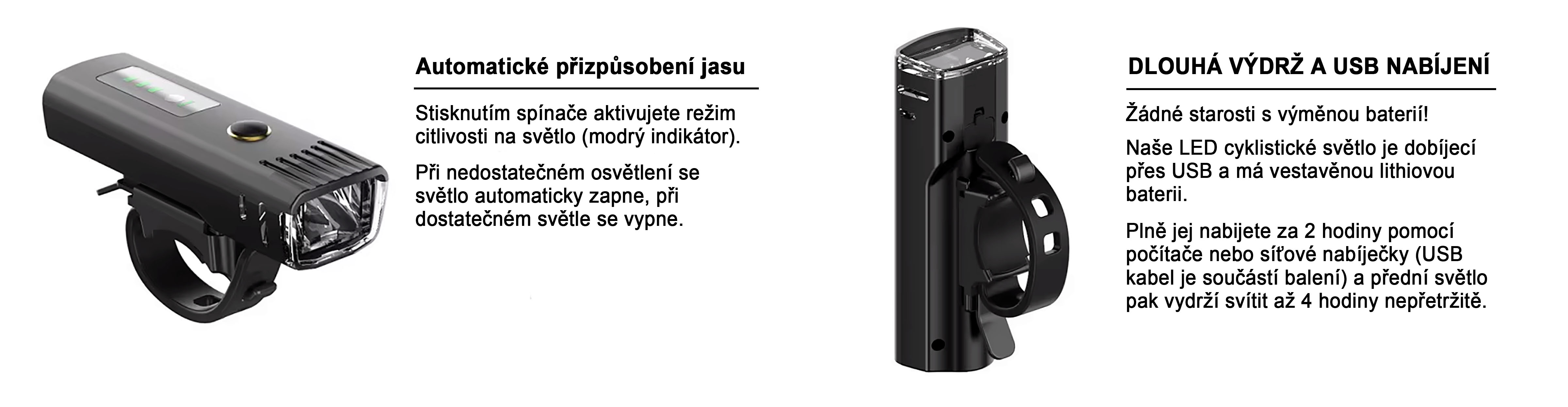 K dispozici jsou 4 režimy osvětlení – silný, střední, blikání a automatický režim. Vestavěná 1500mAh lithiová baterie se nabíjí přes USB kabel, který je součástí balení. Plné nabití trvá přibližně 2 hodiny. Výdrž svícení dosahuje 3–8 hodin podle zvoleného režimu.