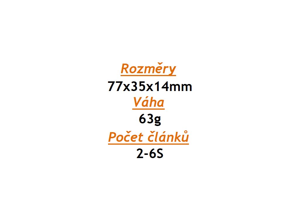 | Počet článků (S): | 2S (7.4V), 3S (11.1V), 4S (14.8V), 5S (18.5V), 6S (22.2V) |